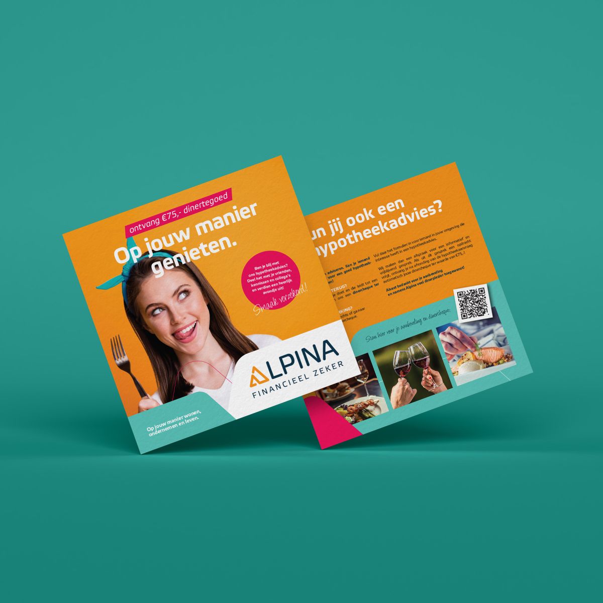 Ook onder de nieuwe naam Alpina is smaak weer verzekerd! Daarvoor mochten we bij lekker in vorm de bestaande Heilbron dinercheque actie in een nieuwe vorm gieten. Naast de digitale flyer maakten we dit keer keer ook een gedrukte variant met daarop een handige QR-code om snel naar je online aanbeveling te kunnen. Wordt deze een succes, dan krijg je een sprankelende Alpina dinercheque in de bus om op jouw manier van te gaan genieten.