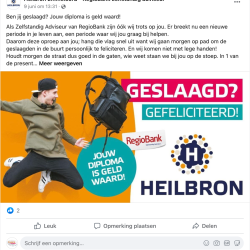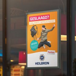 Als je dit jaar je middelbareschooldiploma hebt gehaald, is dat geld waard! Vanuit Alpina Group organiseren meerdere Zelfstandig Adviseurs van Regiobank namelijk een leuke actie, waarbij ze zelfs live in hun buurt naar geslaagden op zoek zijn gegaan om hen te feliciteren. Bij lekker in vorm mochten we meehelpen deze campagne vorm te geven voor diverse entiteiten van Alpina Group, waaronder meerdere Heilbron vestigingen. Er werden onder andere stoepbordposters, raamposters, narrowcasting, advertenties en social media berichten voor ingezet.