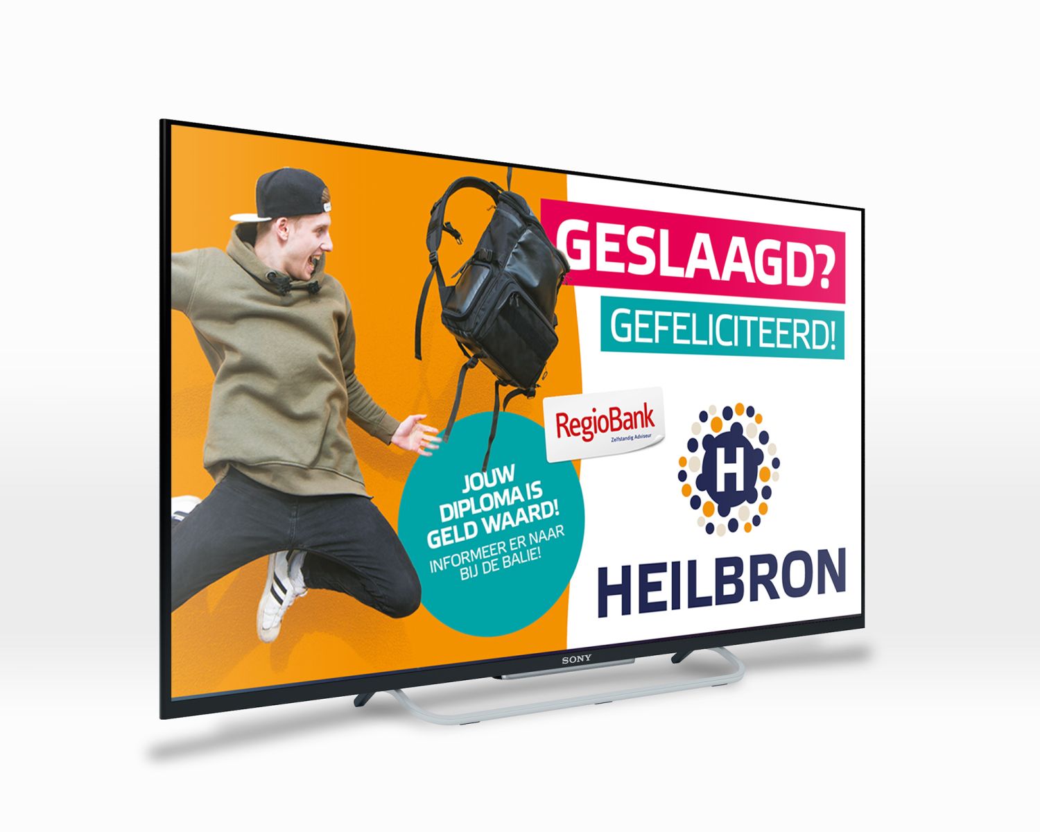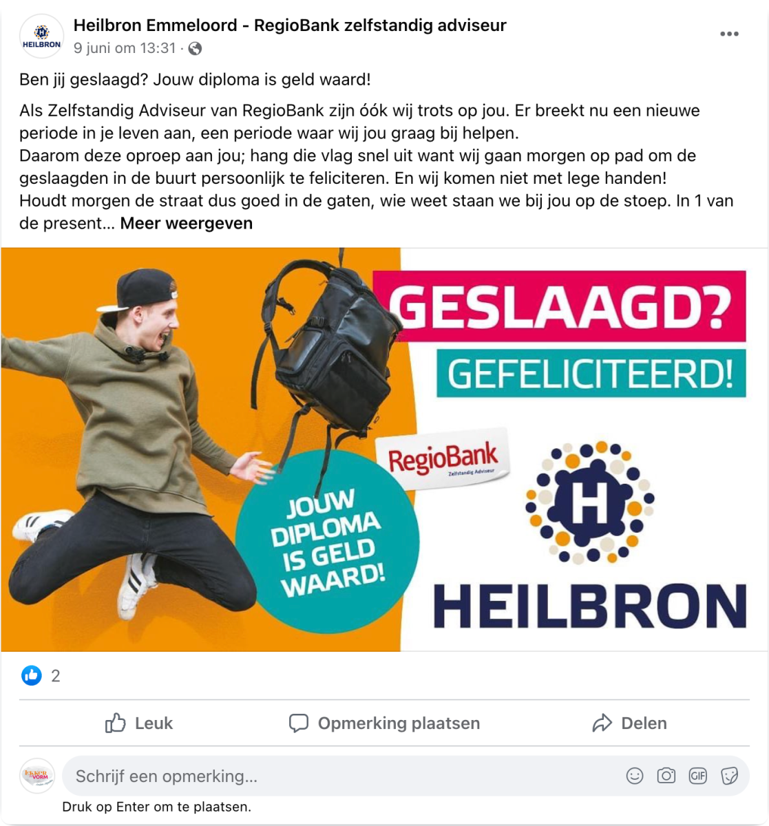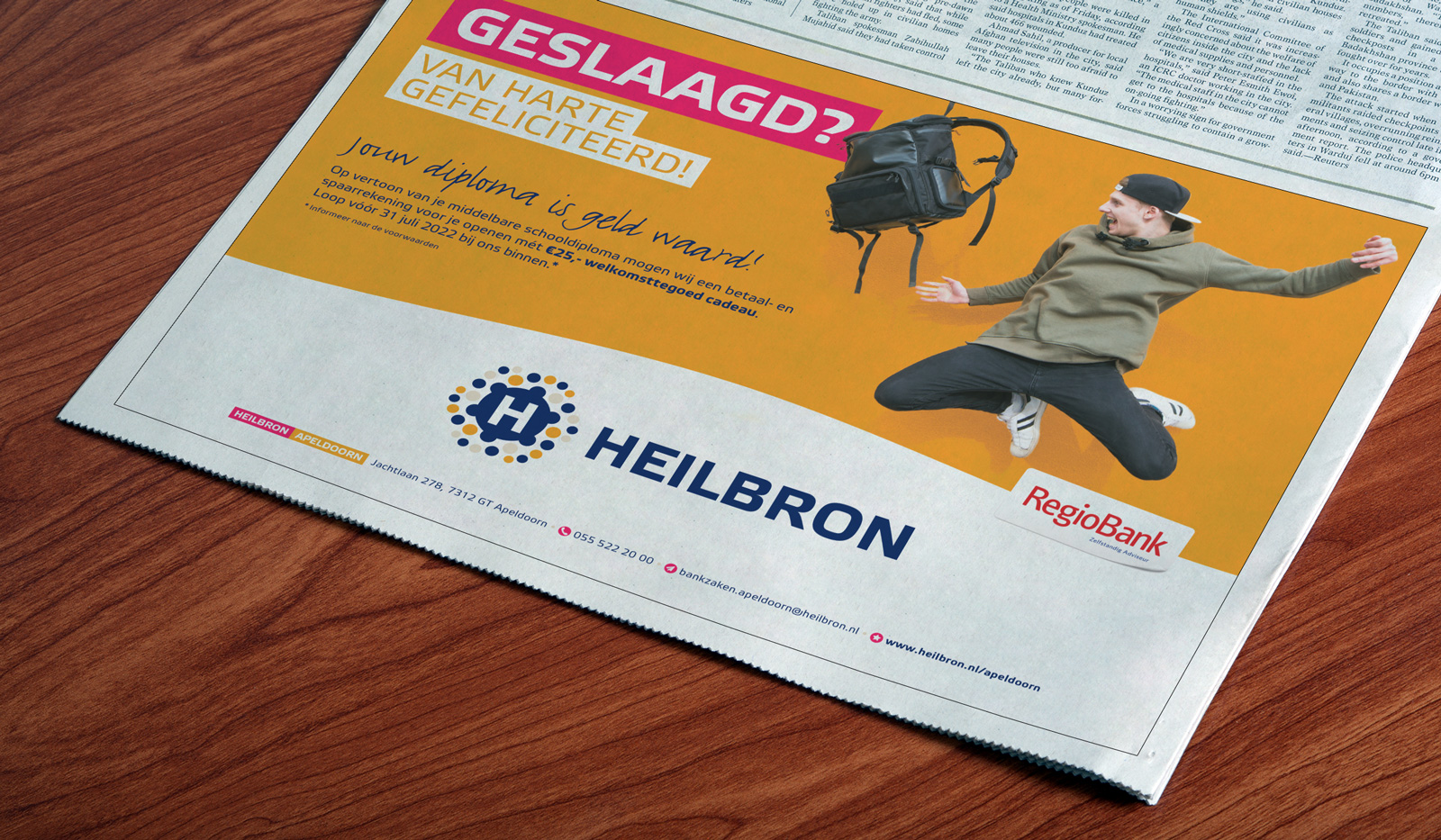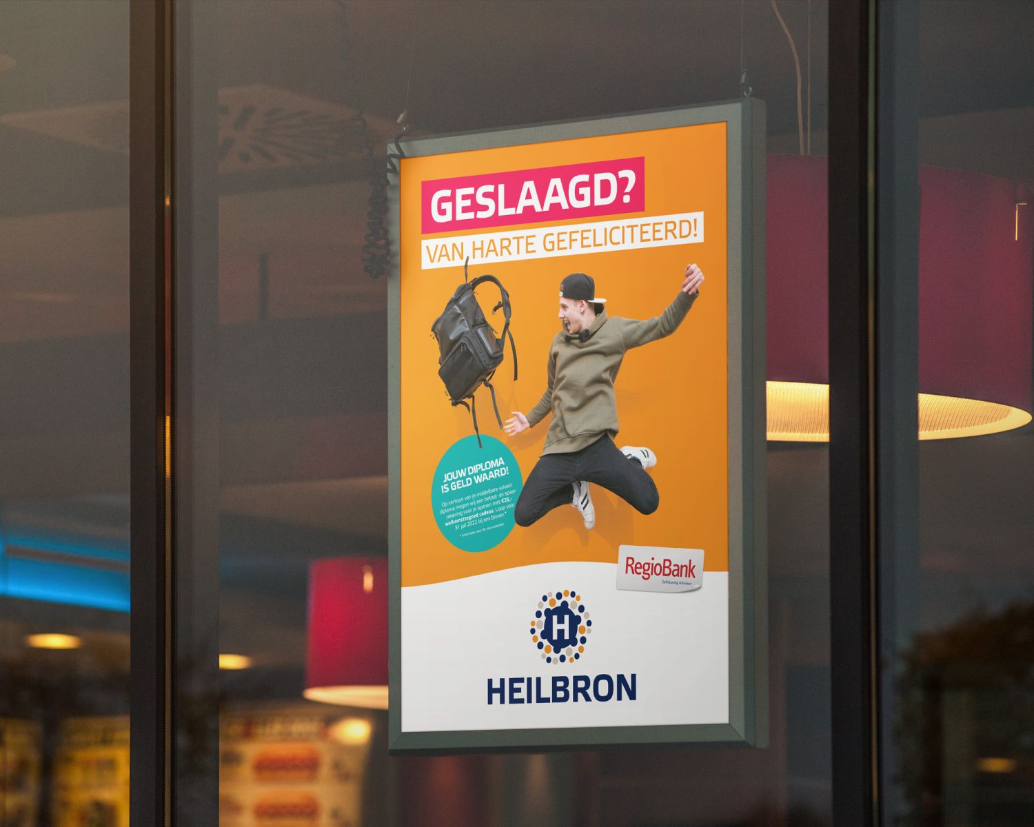 Als je dit jaar je middelbareschooldiploma hebt gehaald, is dat geld waard! Vanuit Alpina Group organiseren meerdere Zelfstandig Adviseurs van Regiobank namelijk een leuke actie, waarbij ze zelfs live in hun buurt naar geslaagden op zoek zijn gegaan om hen te feliciteren. Bij lekker in vorm mochten we meehelpen deze campagne vorm te geven voor diverse entiteiten van Alpina Group, waaronder meerdere Heilbron vestigingen. Er werden onder andere stoepbordposters, raamposters, narrowcasting, advertenties en social media berichten voor ingezet.