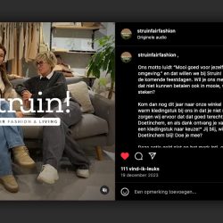 Struin fair fashion & living draagt haar motto “Mooi goed voor jezelf, mooi goed voor je omgeving.” graag extra uit tijdens de feestdagen. Lever een mooi en warm kledingstuk bij de winkel in, dan zorgen Mirte & Hadassa dat dit goed terecht komt bij Kledingbank Doetinchem, en als dank ontvang je 30% korting op een kledingstuk naar keuze! Jij blij, Struin blij, Kledingbank Doetinchem blij!