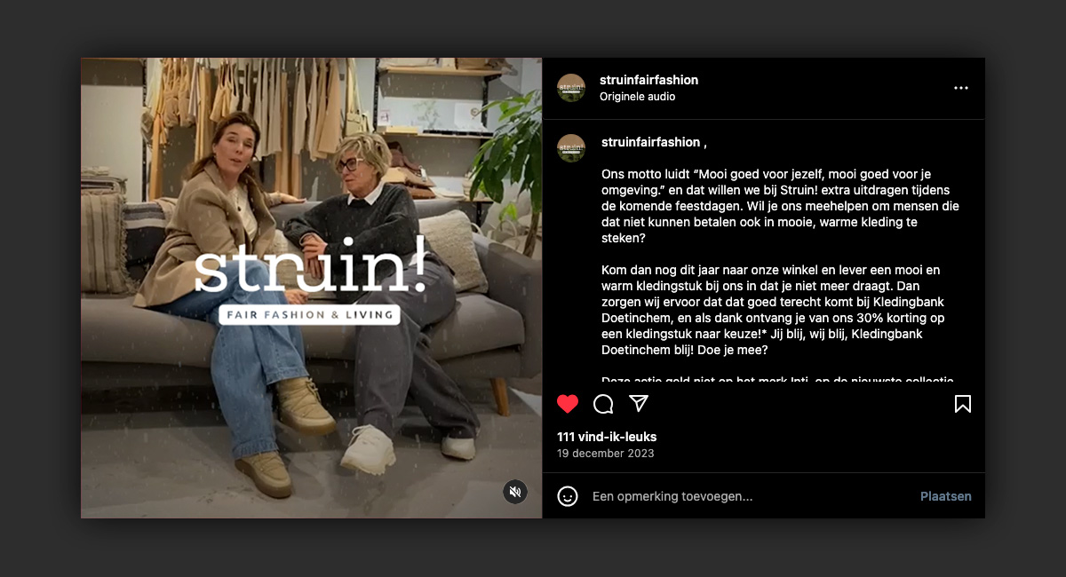 Struin fair fashion & living draagt haar motto “Mooi goed voor jezelf, mooi goed voor je omgeving.” graag extra uit tijdens de feestdagen. Lever een mooi en warm kledingstuk bij de winkel in, dan zorgen Mirte & Hadassa dat dit goed terecht komt bij Kledingbank Doetinchem, en als dank ontvang je 30% korting op een kledingstuk naar keuze! Jij blij, Struin blij, Kledingbank Doetinchem blij!