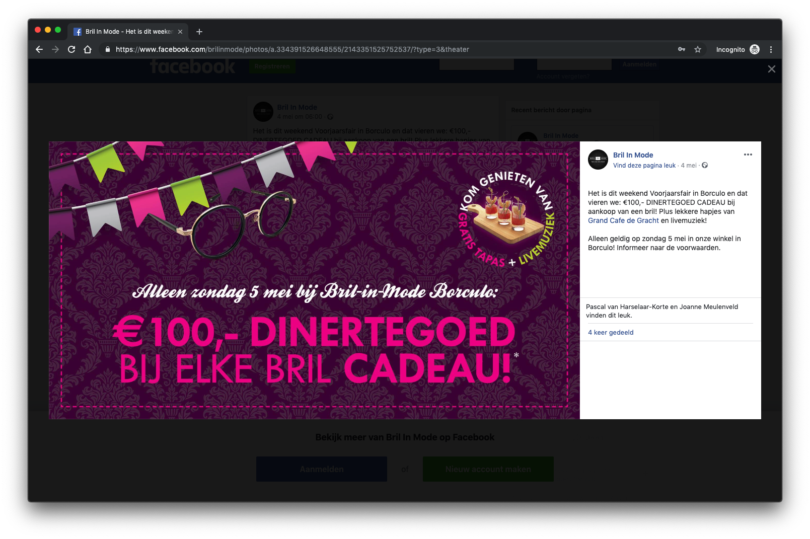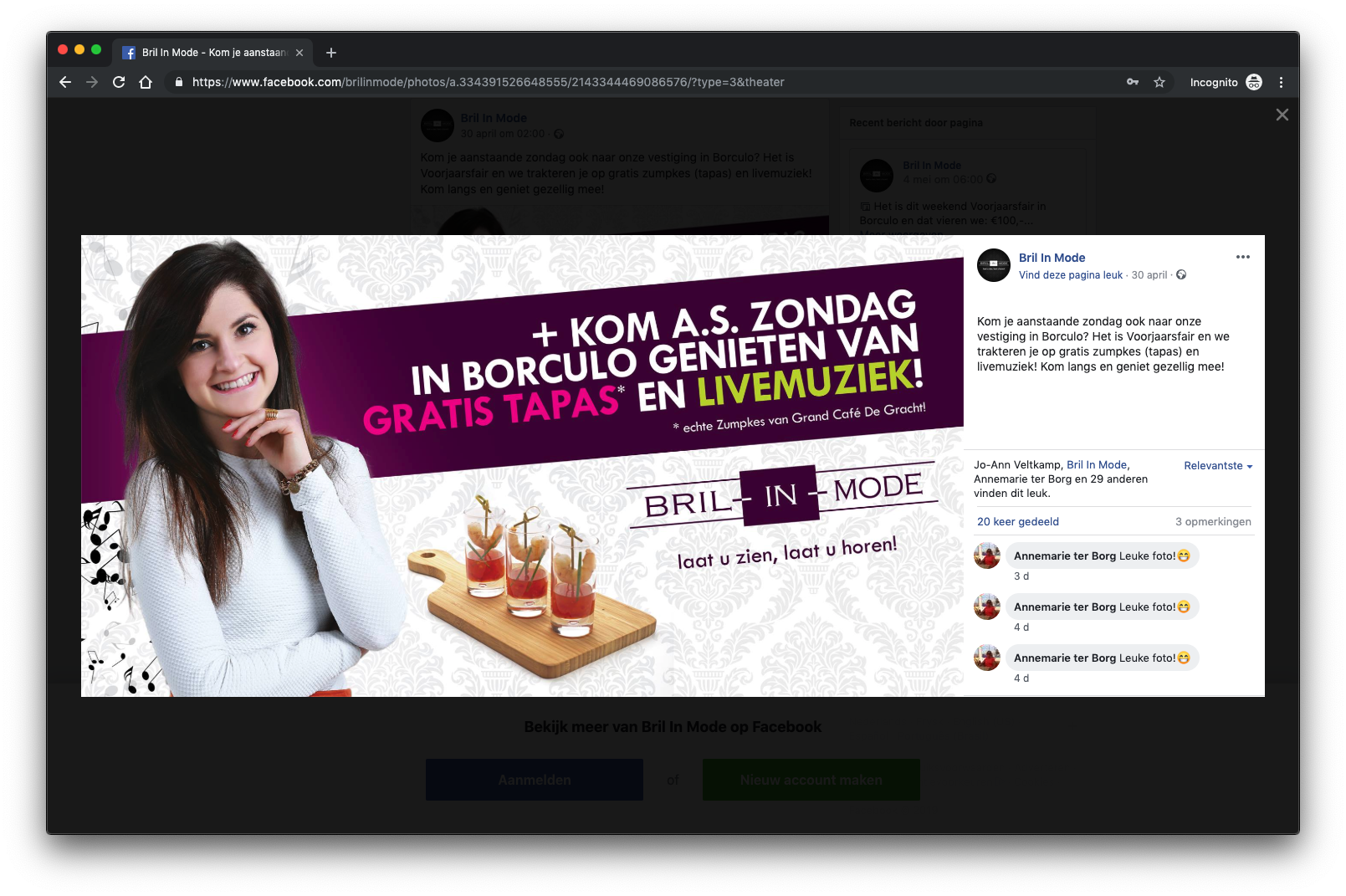 Zondag 5 mei was het weer Voorjaarsfair in Borculo (voorheen de Weerkommn Dagen). En ook dit jaar pakte filiaalmanager Iffet van Bril-in-Mode Borculo feestelijk uit: bij aankoop van een complete bril ontving iedere klant een dinertegoed t.w.v. €100,-! Te besteden bij het grand café op de hoek: De Gracht. Daarnaast trakteerde Bril-in-Mode alle bezoekers op lekkere tapas onder begeleiding van live-muziek.