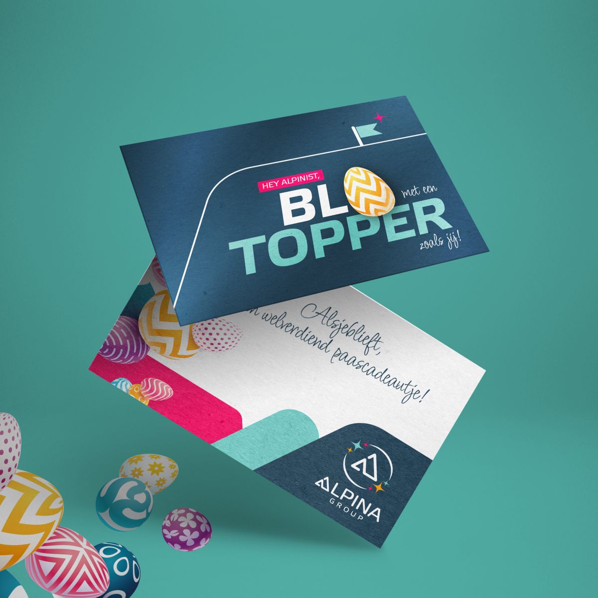 portfolio 🥚 bedankkaartje pasen Onder het thema Bl🥚 met een topper zoals jij! ontvingen de medewerkers van Alpina Group dit Paasweekend een welverdiend paascadeautje. Bij lekker in vorm mochten we het bijbehorende bedankkaartje ontwerpen. bedankkaartje pasen