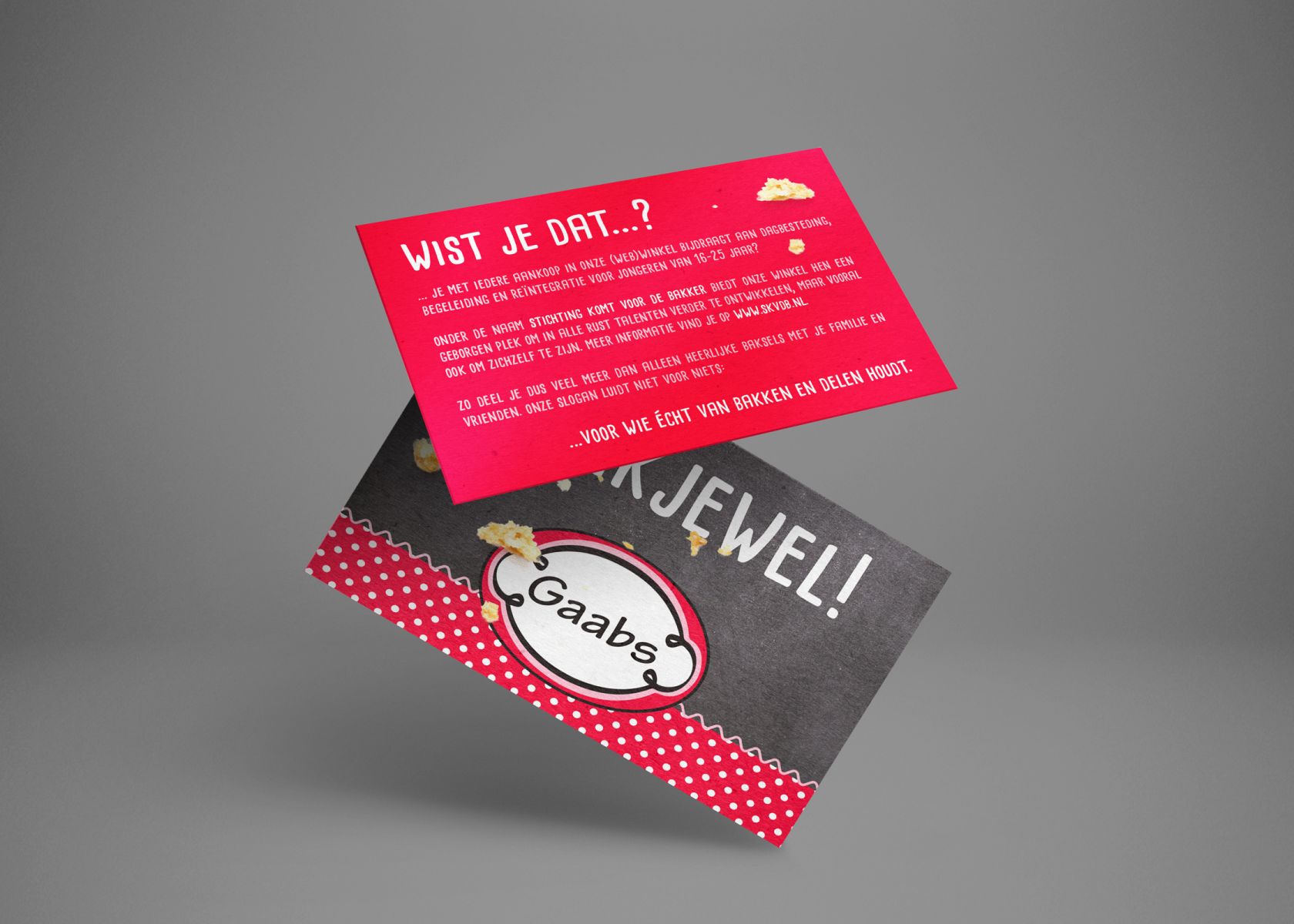 Met iedere aankoop bij bakwinkel Gaabs draag je bij aan het voortbestaan van Stichting Komt voor de Bakker. Om nieuwe klanten hierop te attenderen mochten we bij lekker in vorm een bedankkaartje ontwerpen om makkelijk bij een bestelling of aankoop bij te sluiten.
