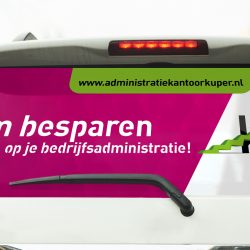 Voor Bianca Kuper mochten we bij lekker in vorm het merkverhaal van Administratiekantoor Kuper over ‘slim besparen’ vertalen naar een bondige achterruitbelettering voor haar auto. Handig uitgevoerd in one-way-vision folie, zodat ze van binnenuit prima zicht naar achteren houdt.