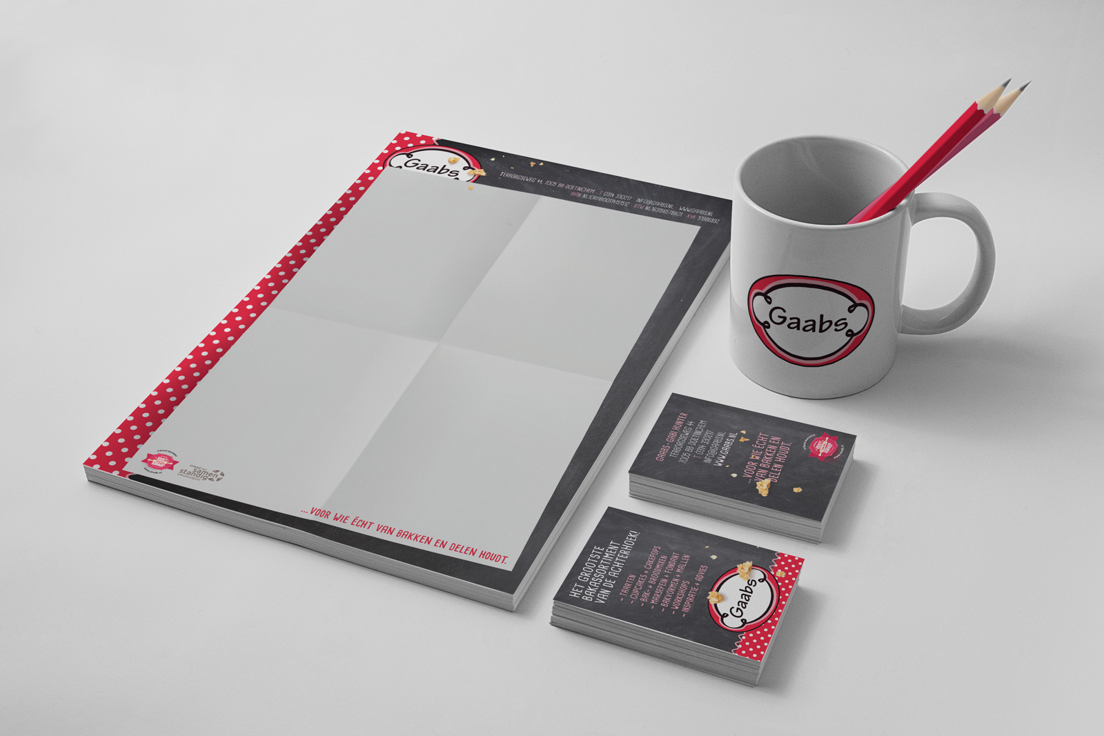 Briefpapier mag meer doen dan alleen de inhoud van je brief of factuur vertellen, zeker als je een bakwinkel hebt. Daarom ontwierp lekker in vorm smaakmakend briefpapier en bijpassende visitekaartjes voor Gaabs in Doetinchem. Er moest een oplossing gevonden worden voor de leesbaarheid van het briefpapier, omdat de huisstijl normaalgesproken een krijtbord-achtergrond heeft. Dit is uiteindelijk gelukt door een ouderwets receptvelletje er digitaal bovenop te plaatsen.