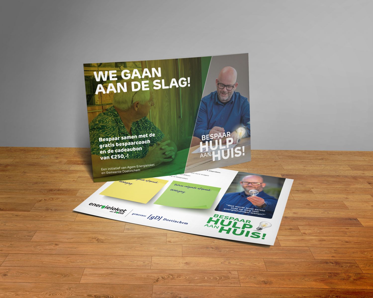 Bij lekker in vorm ontwikkelden we voor deze campagne de titel, een bijpassend logo in Agem stijl en twee direct mailings die per gemeente gepersonaliseerd zijn. De eerste mailingkaart wordt onder ander via de woningbouwverenigingen aangeboden, de tweede neemt de bespaarcoach mee naar het eerste gesprek, zodat je als klant overzichtelijk kunt ziet wat je wanneer mag verwachten. Passend bij Agem zijn beide mailings gedrukt op BalancePure®, een 100% gerecyclede milieuvriendelijke papiersoort.