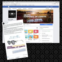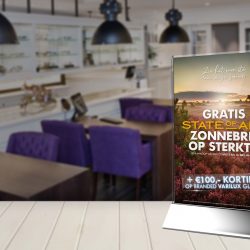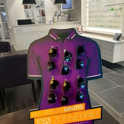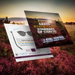 Bij lekker in vorm ontwierpen we deze actiematige zomercampagne met lokale sfeer, bestaande uit een huis-aan-huis flyer, een lokale advertentie in een couponnenboekje en diverse items in en rondom de winkel en online. Speciaal voor het etaleren van de zonnebrillen waaruit je gratis kunt kiezen, ontwierpen we een contourgesneden forex display voor in elke winkel. In elk van de zes gaten kan het pootje van een pasmodel gestoken worden.