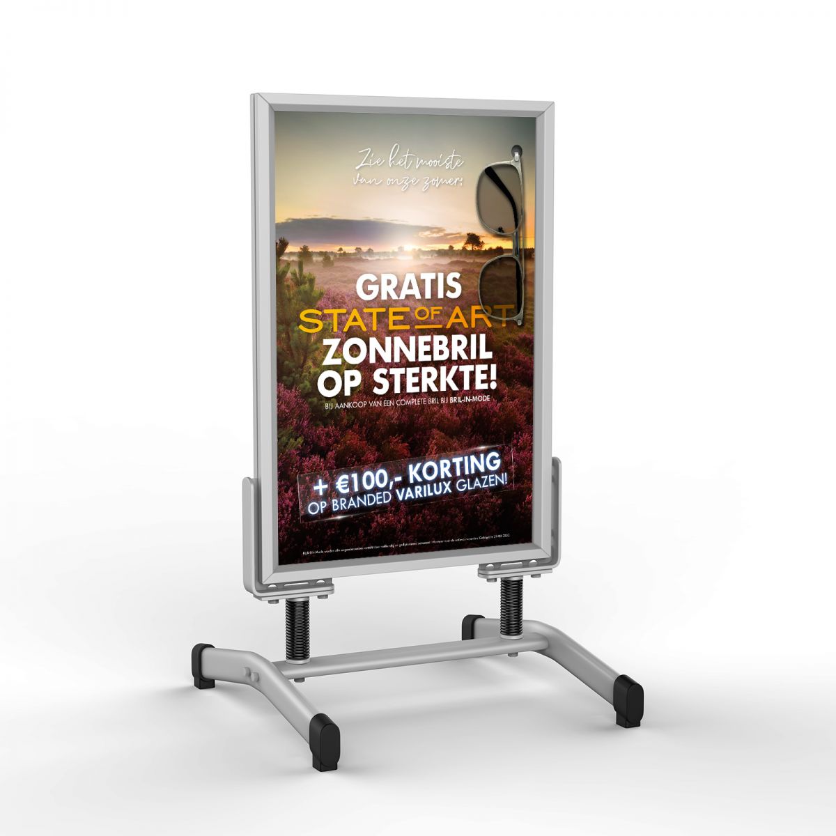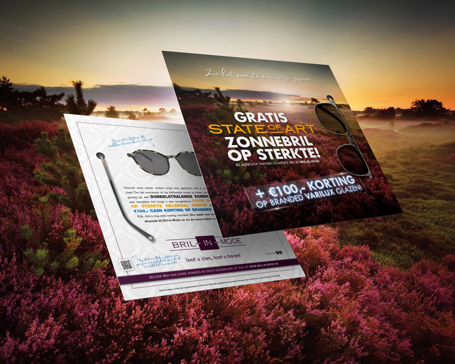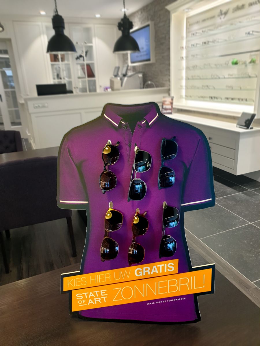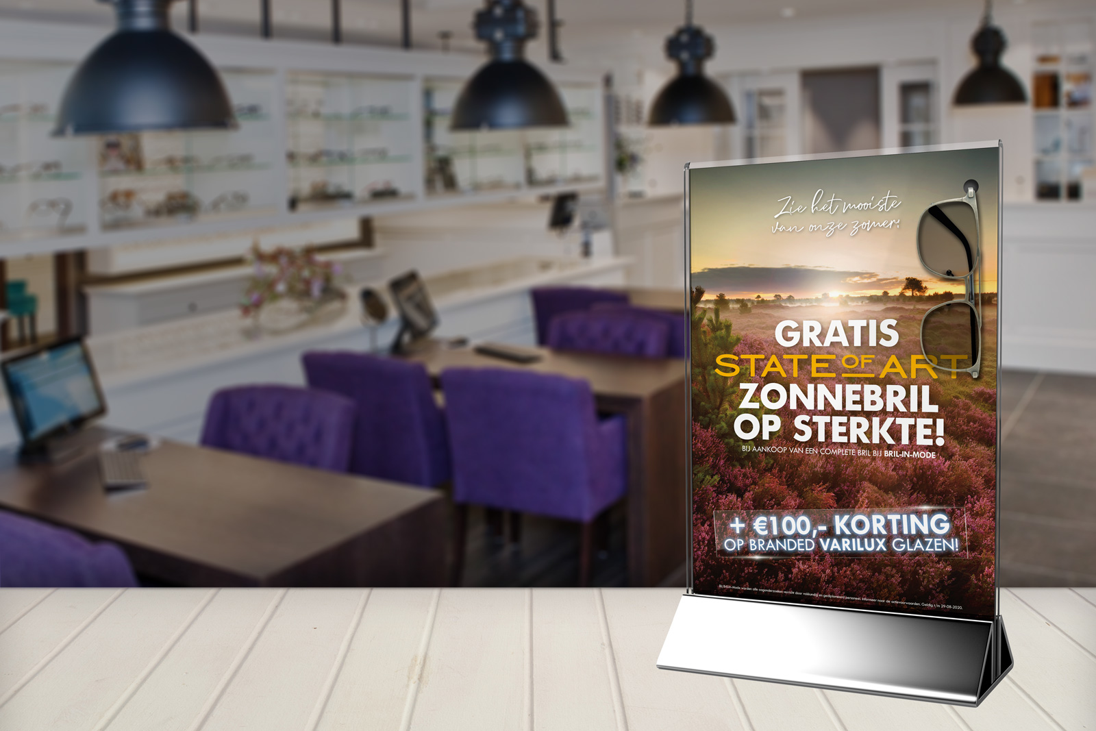 Bij lekker in vorm ontwierpen we deze actiematige zomercampagne met lokale sfeer, bestaande uit een huis-aan-huis flyer, een lokale advertentie in een couponnenboekje en diverse items in en rondom de winkel en online. Speciaal voor het etaleren van de zonnebrillen waaruit je gratis kunt kiezen, ontwierpen we een contourgesneden forex display voor in elke winkel. In elk van de zes gaten kan het pootje van een pasmodel gestoken worden.