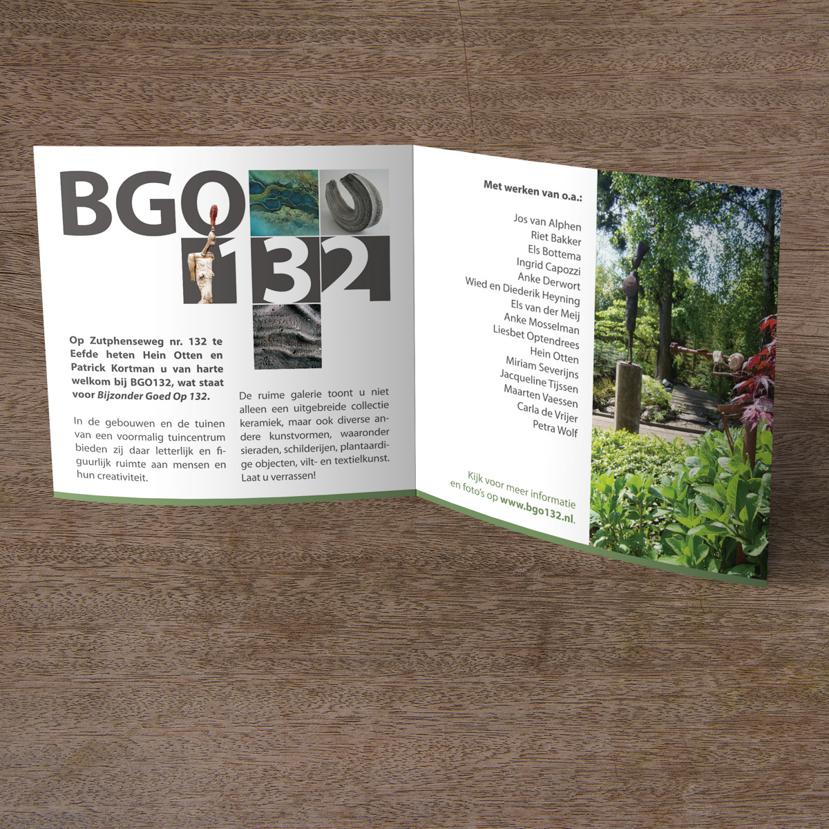 Om in één oogopslag duidelijk te maken welke diensten BGO132 verleent en welke kunst je zoals in de galerie mag verwachten, ontwikkelde lekker in vorm creatieve merksetters deze corporate folder op meeneemformaat (10,5 bij 10,5 cm).