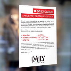 Daily Women’s Wear houdt de ontwikkelingen rondom coronavirus Covid-19 nauwlettend in de gaten en blijft actief communiceren met haar achterban over de actuele stand van zaken. Bij lekker in vorm mogen we de damesmodewinkel bijstaan met passende teksten in de diverse fases van de crisis. We zorgden onder andere voor berichtgeving op social media en in de winkel over genomen maatregelen en aangepaste openingstijden. De raamposters zijn bij uitzondering wit in plaats van zwart, zodat het team ze makkelijk zelf kan printen.