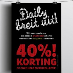Daily gaat binnenkort een private label collectie voeren met duurzame ecogarens. Om hiervoor ruimte te maken organiseert Daily eerst een uitverkoop van haar zomercollectie. lekker in vorm ontwierp diverse saleproducten met de titel ‘Daily breit uit!’. De advertentie, raambelettering, posters en advertorial zijn deels informerend, deels actiematig.