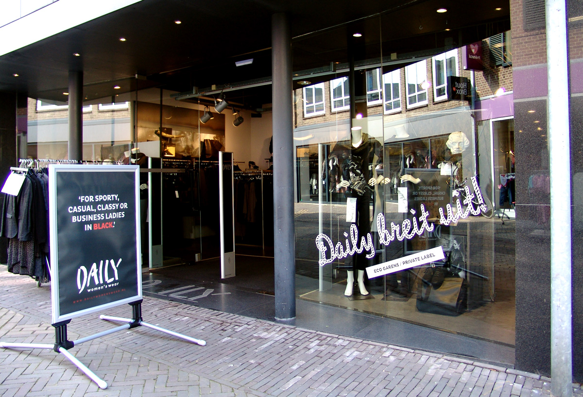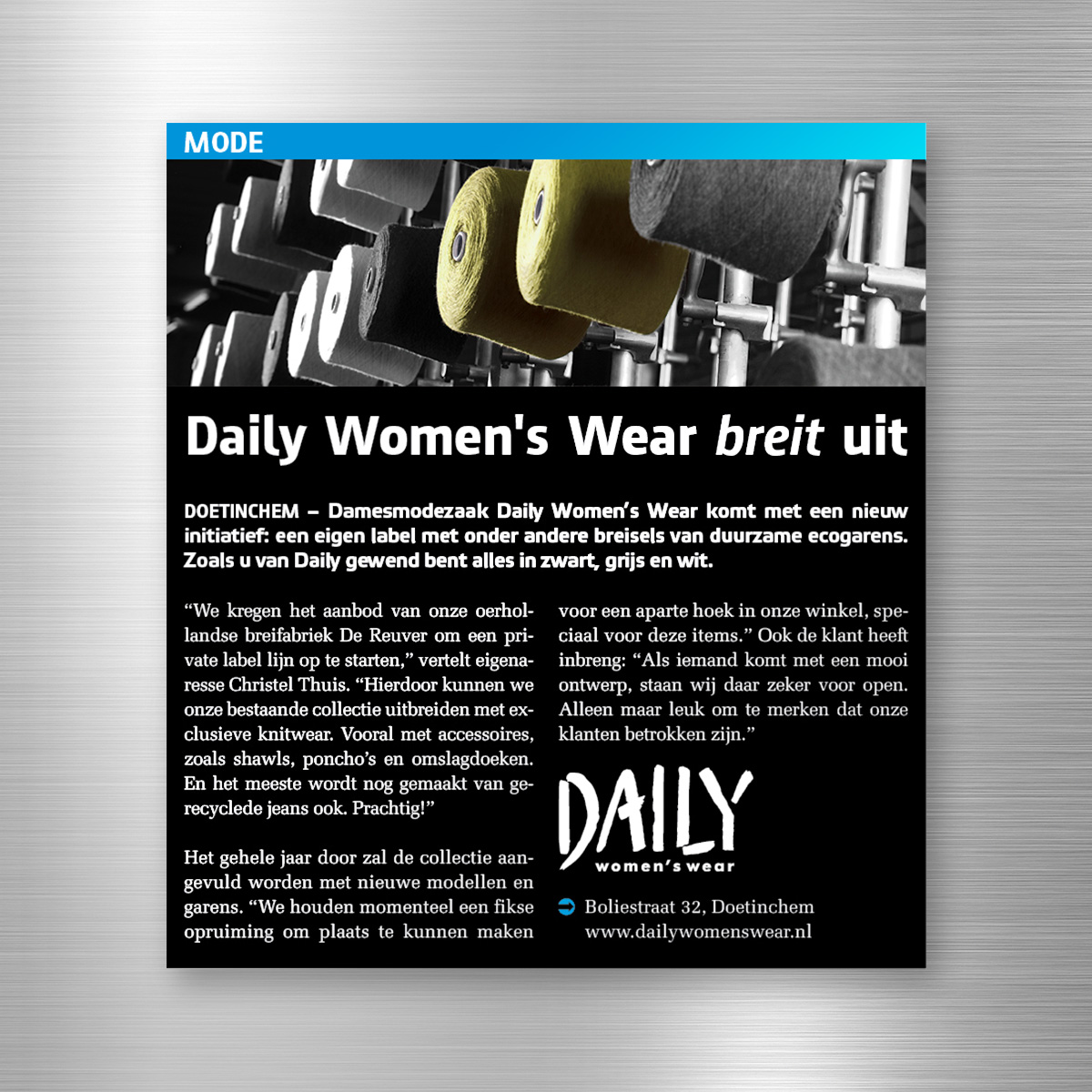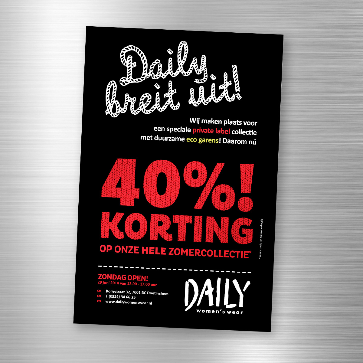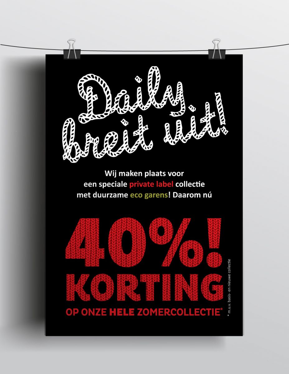 Daily gaat binnenkort een private label collectie voeren met duurzame ecogarens. Om hiervoor ruimte te maken organiseert Daily eerst een uitverkoop van haar zomercollectie. lekker in vorm ontwierp diverse saleproducten met de titel ‘Daily breit uit!’. De advertentie, raambelettering, posters en advertorial zijn deels informerend, deels actiematig.