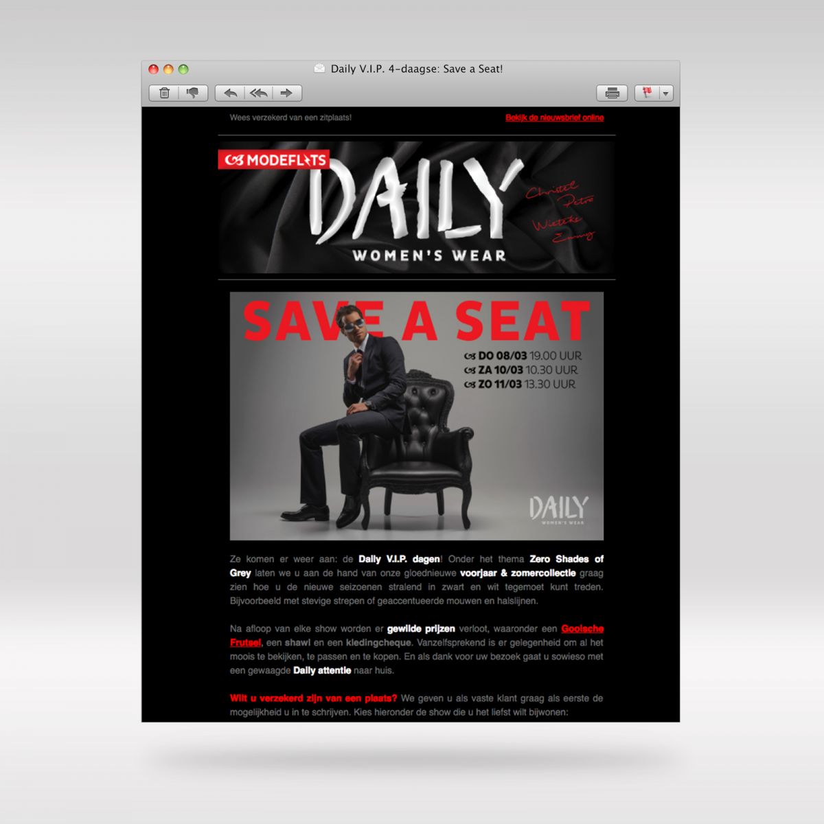 lekker in vorm verzorgde ook dit keer weer de ontwerpen en de teksten, in de vorm van een uitnodiging c.q. kortingskaart, een stoepbordposter en een digitale nieuwsbrief om alvast een plaats mee te reserveren.