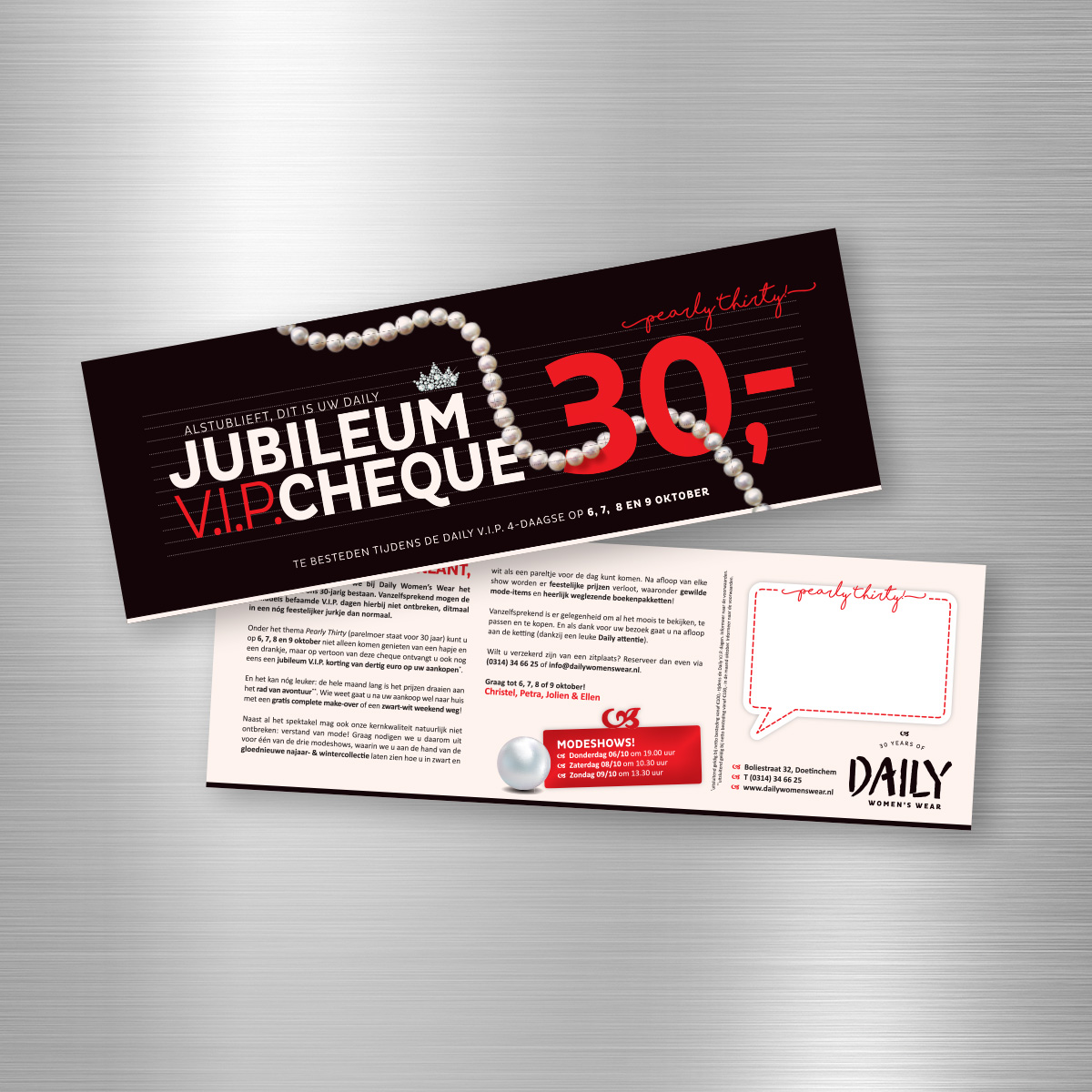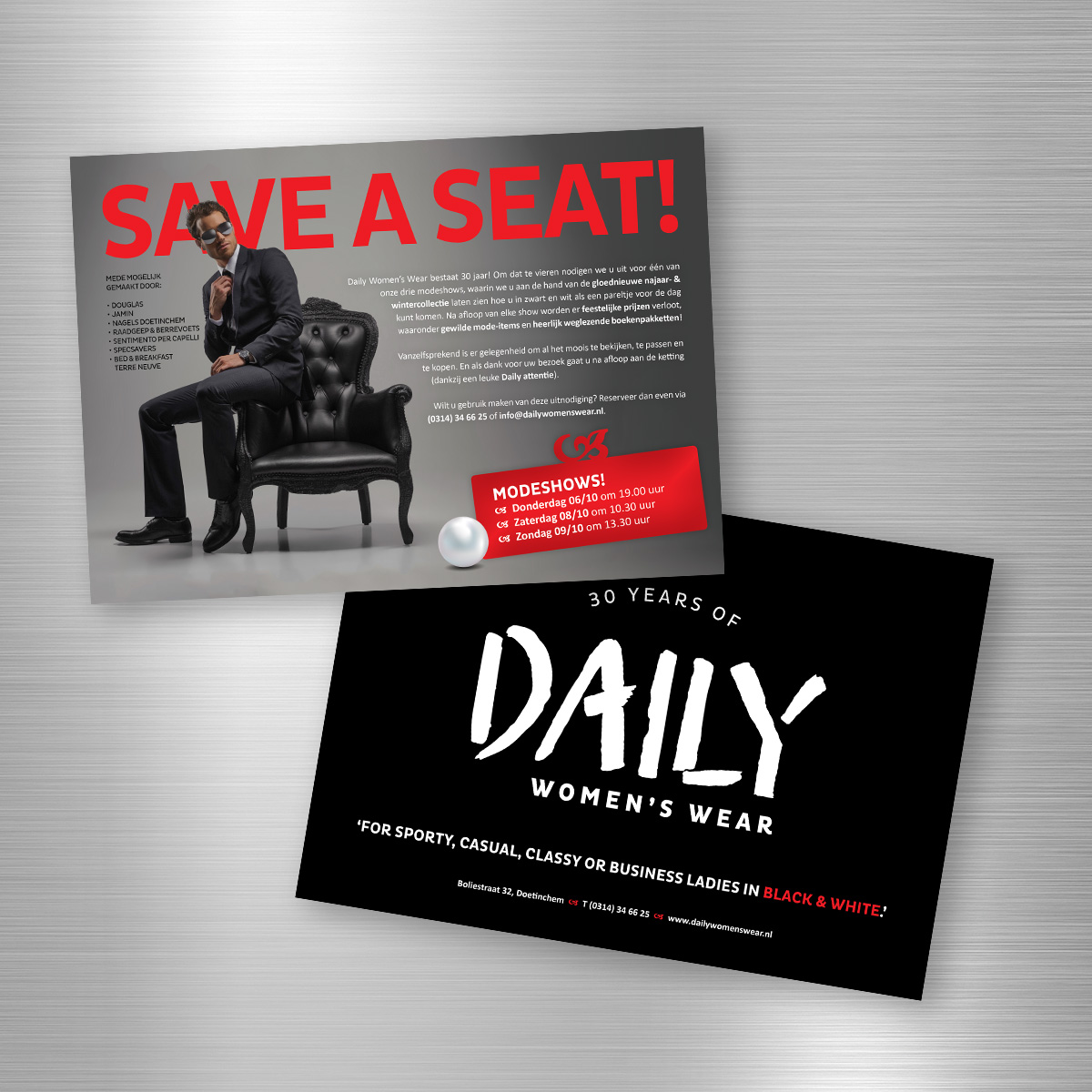 In oktober 2016 viert Daily Women’s Wear het hoogtepunt van haar 30-jarig bestaand onder het V.I.P. thema Pearly Thirty. lekker in vorm mocht ook deze keer weer zorgen voor de ontwerpen en teksten, in de vorm van een direct mail (uitnodiging), raambelettering, een save a seat flyer en bijpassende nieuwsbrief. De uitnodiging werd voor de speciale gelegenheid gedrukt op het luxe parelmoerpapier CHROMOLUX Pearl.