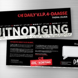 portfolio daily vip 4-daagse: zilver De Daily V.I.P. dagen staan weer voor de deur, met een hapje en een drankje en diverse modeshows. lekker in vorm ontwierp een sprankelende uitnodiging c.q. kortingskaart, passend binnen het thema ‘zilver’. uitnodiging