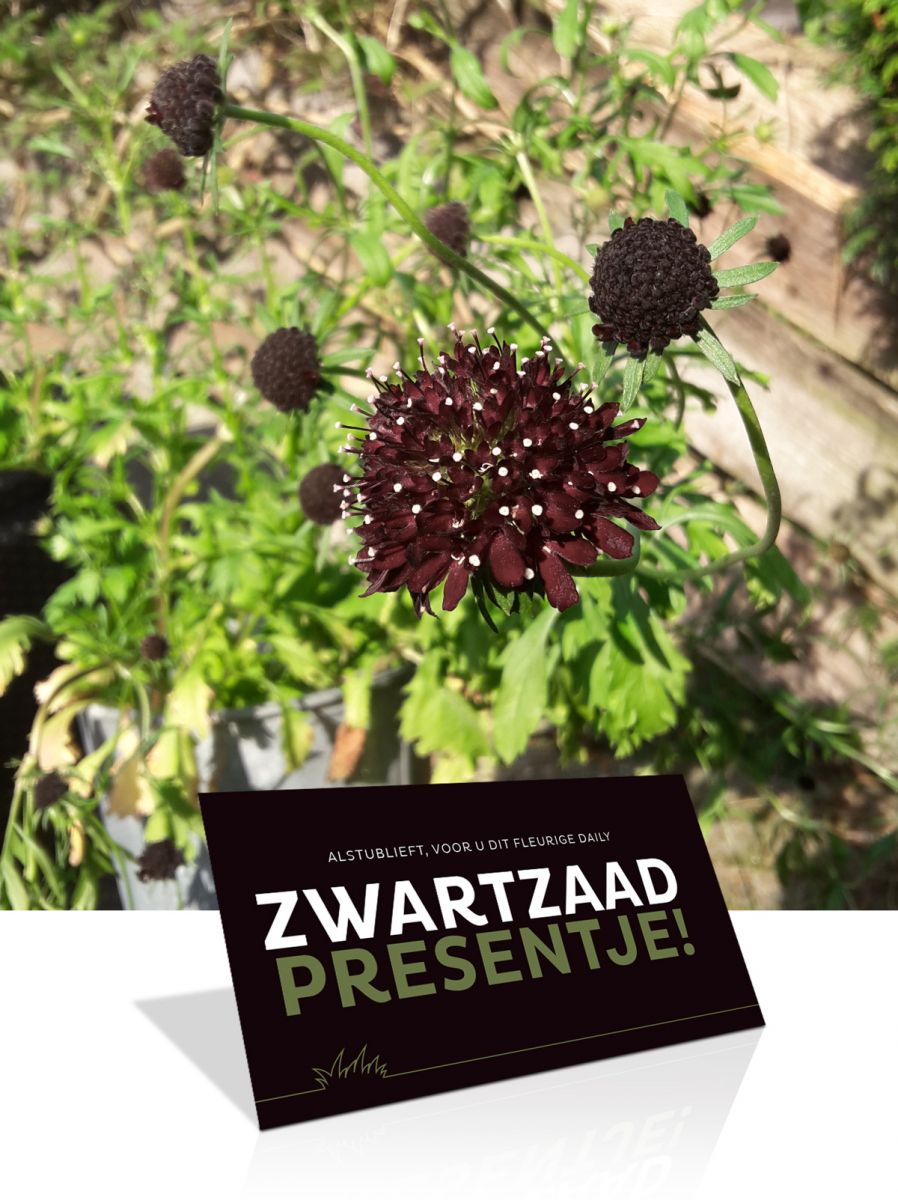 Tijdens de “Awakenings” V.I.P dagen ging je als bezoeker bij Daily Women’s Wear naar huis met een passend cadeau: Het Zwartzaad Presentje, bestaande uit een zakje met zaden van de Scabiosa Atropurpurea ‘Black Knight’ en een waardebon t.w.v. 10% korting voor wanneer de bloem in bloei staat. lekker in vorm dacht mee over dit concept en mocht daarna vanzelfsprekend het artwork verzorgen. Oh, en natuurlijk hadden we ook braaf een exemplaar in de achtertuin!