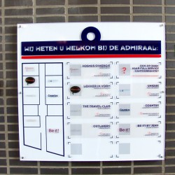 Wij en onze buren zijn voortaan goed vindbaar, dankzij dit logobord in de entree, door ons verzorgd voor bedrijfsverzamelgebouw De Admiraal Doetinchem. Het bord zelf is uitgevoerd in mooi dik plexiglas en de huurders worden aangeduid via statische bestickering.