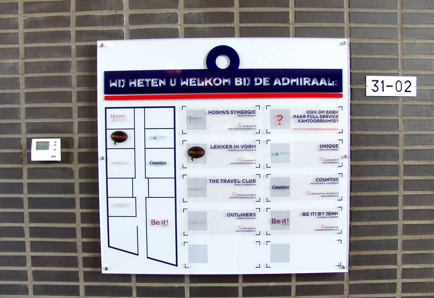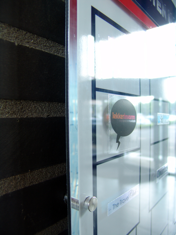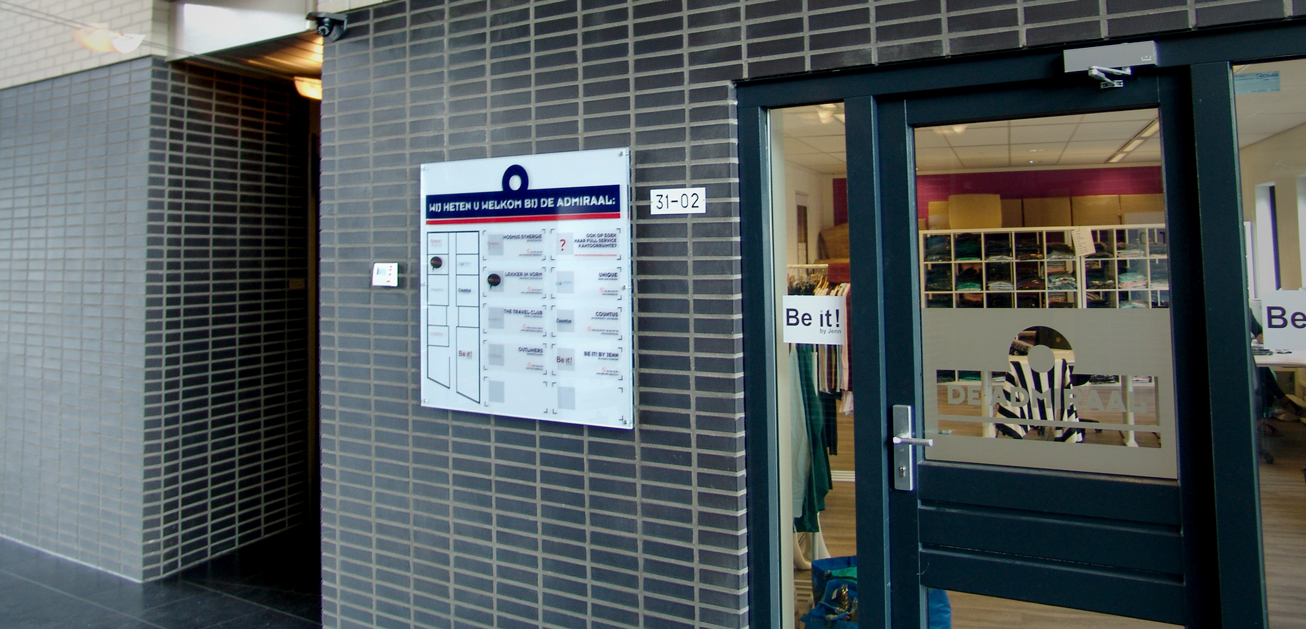 Wij en onze buren zijn voortaan goed vindbaar, dankzij dit logobord in de entree, door ons verzorgd voor bedrijfsverzamelgebouw De Admiraal Doetinchem. Het bord zelf is uitgevoerd in mooi dik plexiglas en de huurders worden aangeduid via statische bestickering.