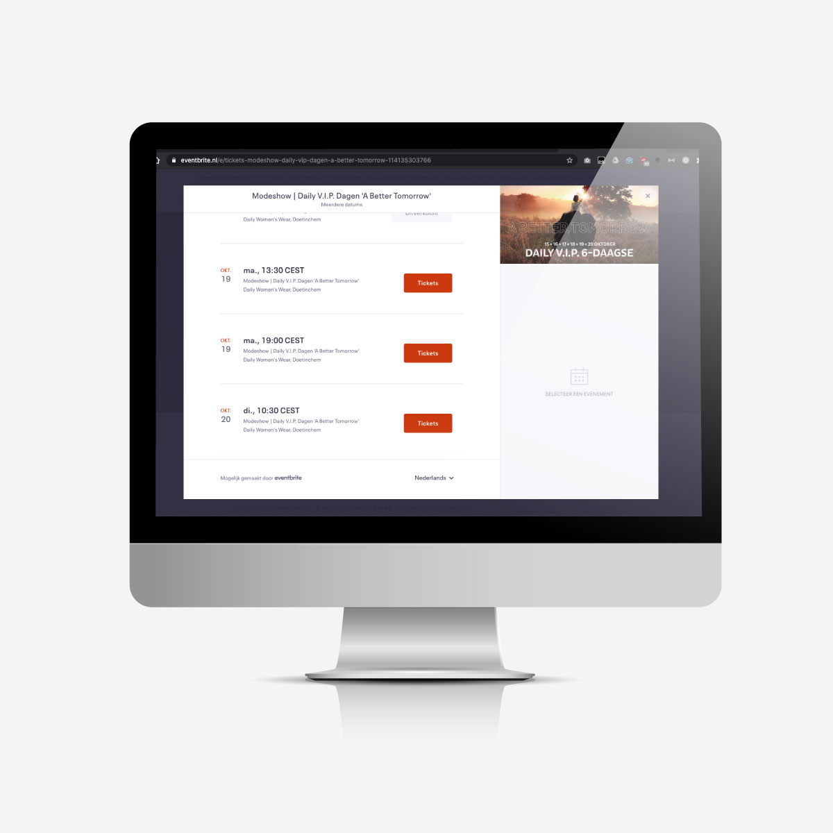 Om de aangepaste V.I.P. dagen met hun vele modeshows en aangescherpte coronaregels in juiste banen te leiden, mochten we bij lekker in vorm het online gratis ticketysteem Eventbrite inrichten voor Daily Women’s Wear. De beschikbaarheid van elke modeshow is hier voor klanten makkelijk online inzichtelijk gemaakt en de gratis kaartjes met QR-code kunnen zonder tussenkomst van de winkel aangeschaft worden. Bovendien staan de bezoekersgegevens meteen goed geregistreerd volgens de huidige richtlijnen. De eventpagina hebben we tot slot mooi aangekleed met duidelijke teksten en sfeerbeeld en gepromoot via een nieuwsbrief, de website van Daily zelf en social media.
