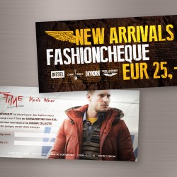 Om klanten aan te moedigen in het nieuwe jaar nog eens terug te komen voor een herhalingsbezoek, deelt T-Time tijdens de sale fashioncheques uit ter waarde van 25 euro, te besteden op de zogenaamde ‘new arrivals’ in het nieuwe seizoen. lekker in vorm ontwierp de waardecheque en liet deze drukken op 250 g/m² Magic Chrome papier, gekenmerkt door een spiegelend zilveren voorzijde.