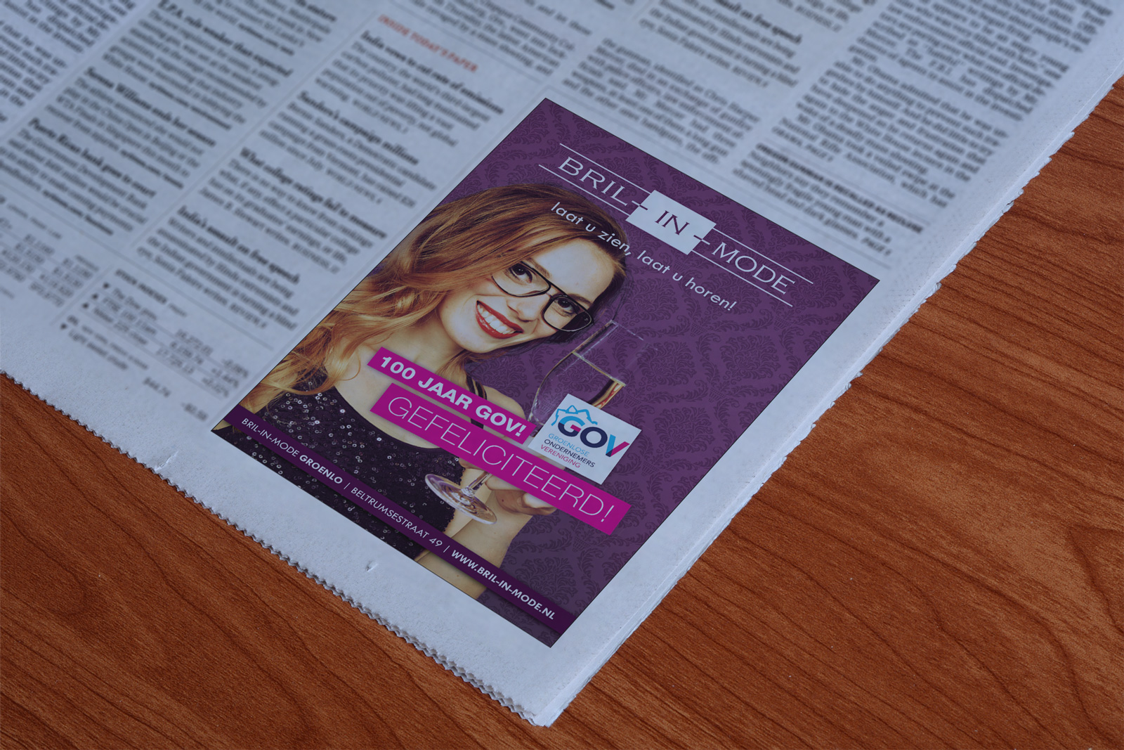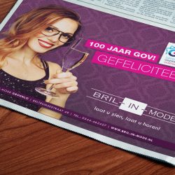 portfolio felicitatieadvertenties GOV De Groenlose Ondernemers Vereniging (GOV) bestaat 100 jaar! Dat is namens Bril-in-Mode zeker een felicitatie waard. Bij lekker in vorm mochten we er twee feestelijke felicitatieadvertenties voor ontwerpen. advertentie ligggend advertentie staand