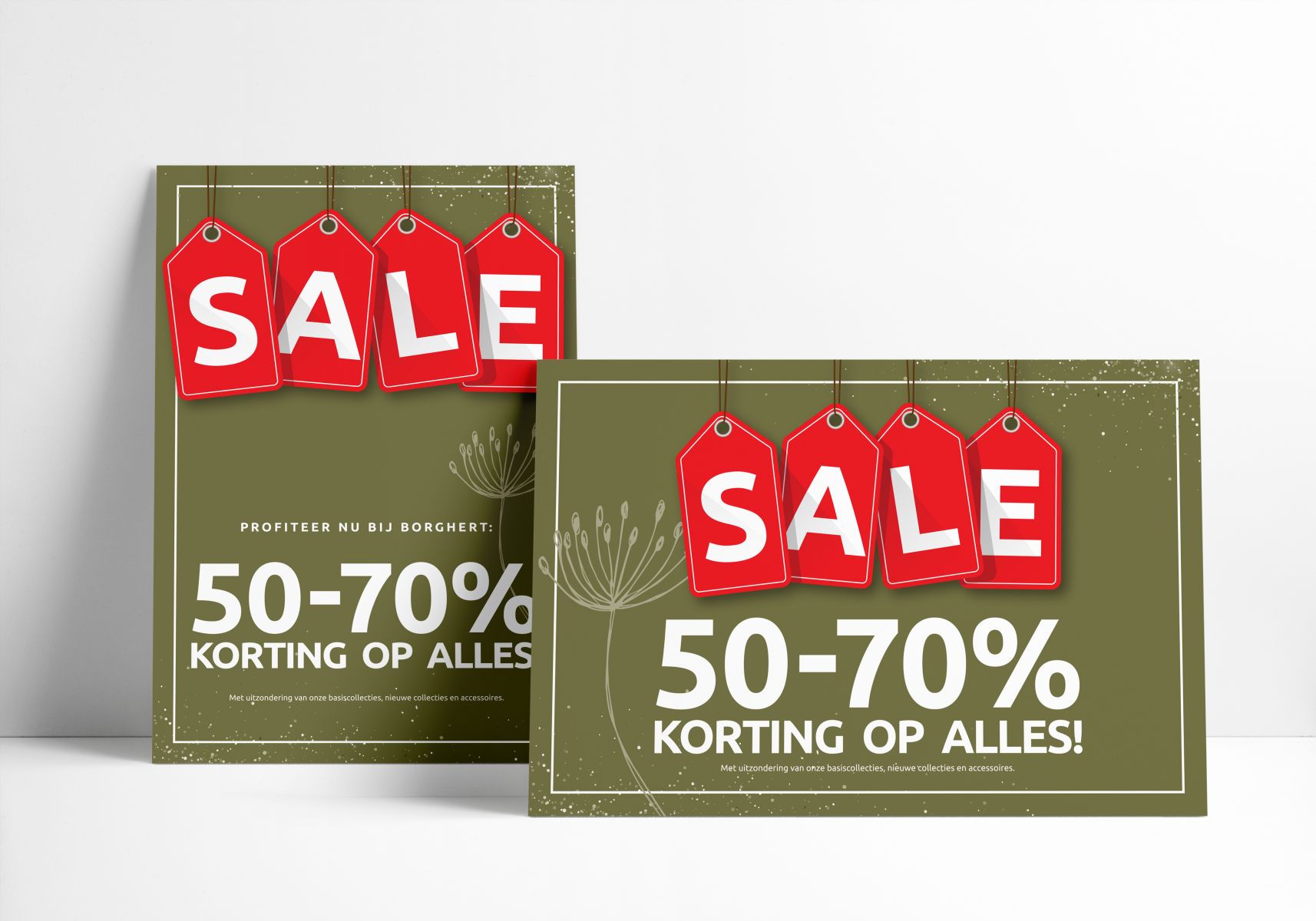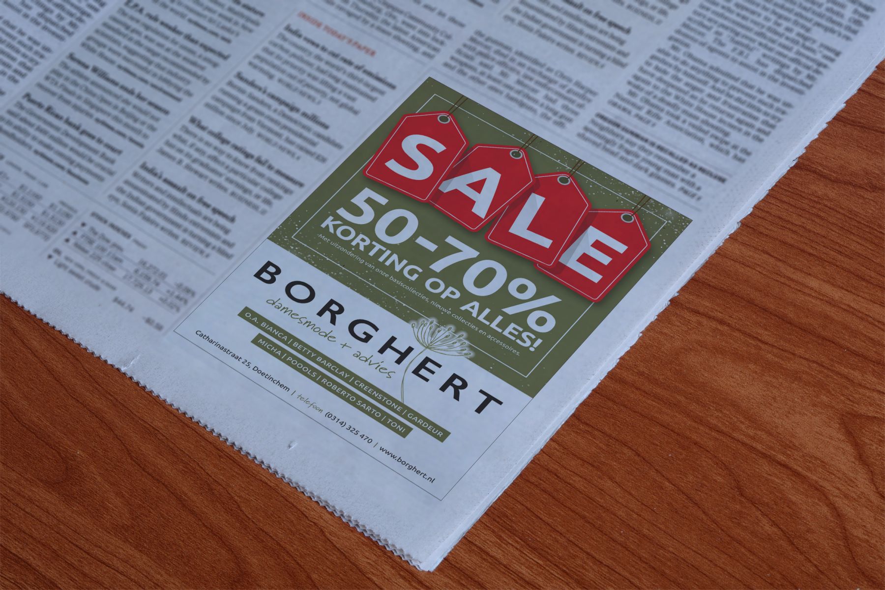 Tijdens de Final Sale bij Borghert damesmode + advies mogen de laatste kwaliteitsitems uit de oude collecties weg met 50% of soms wel 70% korting. Bij lekker in vorm mochten we er een aanvullende campagne voor extra attentiewaarde voor vormgeven, bestaande uit een een advertentie in de Doetinchemmer en diverse point of sale items in de winkel.