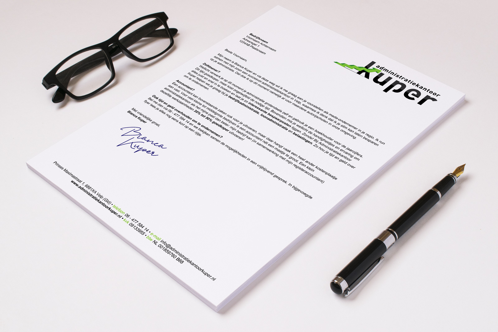 Zakelijk besparen door je administratie slim uit te besteden? In deze zakelijke flyer wijst Administratiekantoor Kuper ondernemers op de voordelen. Bij lekker in vorm mochten we hem samen met een begeleidende brief schrijven, ontwerpen en laten drukken.