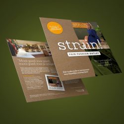 Met deze mooie flyer op houtvrij offset natuurkarton kan fair fashion outlet Struin! zich ook zichtbaar maken buiten het centrum van Doetinchem. De flyer wordt meegegeven in de winkel en op diverse plekken neergelegd waar fait trade liefhebbers uit de regio zich ophouden.