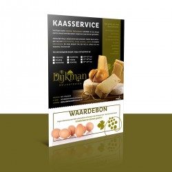 portfolio flyer kaasservice Om bewoners te attenderen óp en te enthousiasmeren vóór de kaasservice aan huis van Dijkman Delicatessen, ontwikkelde lekker in vorm een smakelijke flyer met aangehechte waardebon. flyer