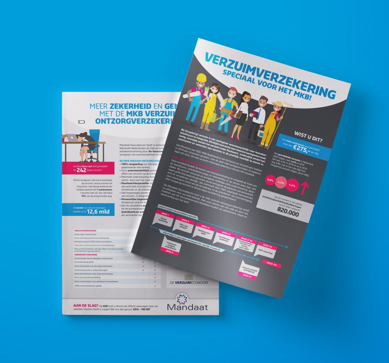 Financieel adviseurs kunnen via Mandaat voortaan een speciale MKB verzuim ontzorgverzekering aanbieden aan zakelijke klanten. Bij lekker in vorm mochten we er een sprekende infosheet voor opmaken. Door middel van kleurrijke illustraties, weetjes en grafieken werd de feitelijke informatie prettig leesbaar gemaakt.