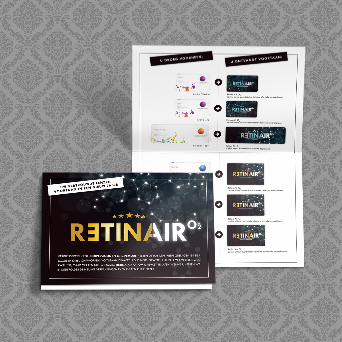 portfolio folder black label contactlenzen Om bestaande contactlensklanten van Bril-in-Mode te attenderen op de vernieuwde verpakkingen mochten we bij lekker in vorm een overzichtelijke folder ontwerpen met het oude en het nieuwe ontwerp naast elkaar. folder klapkaart