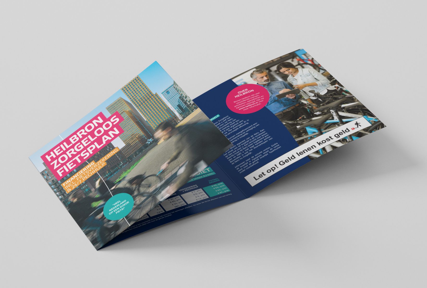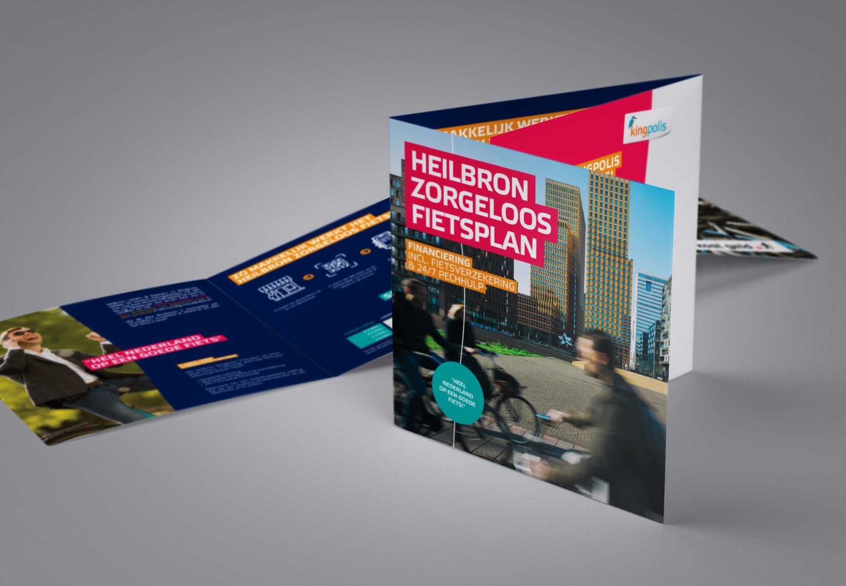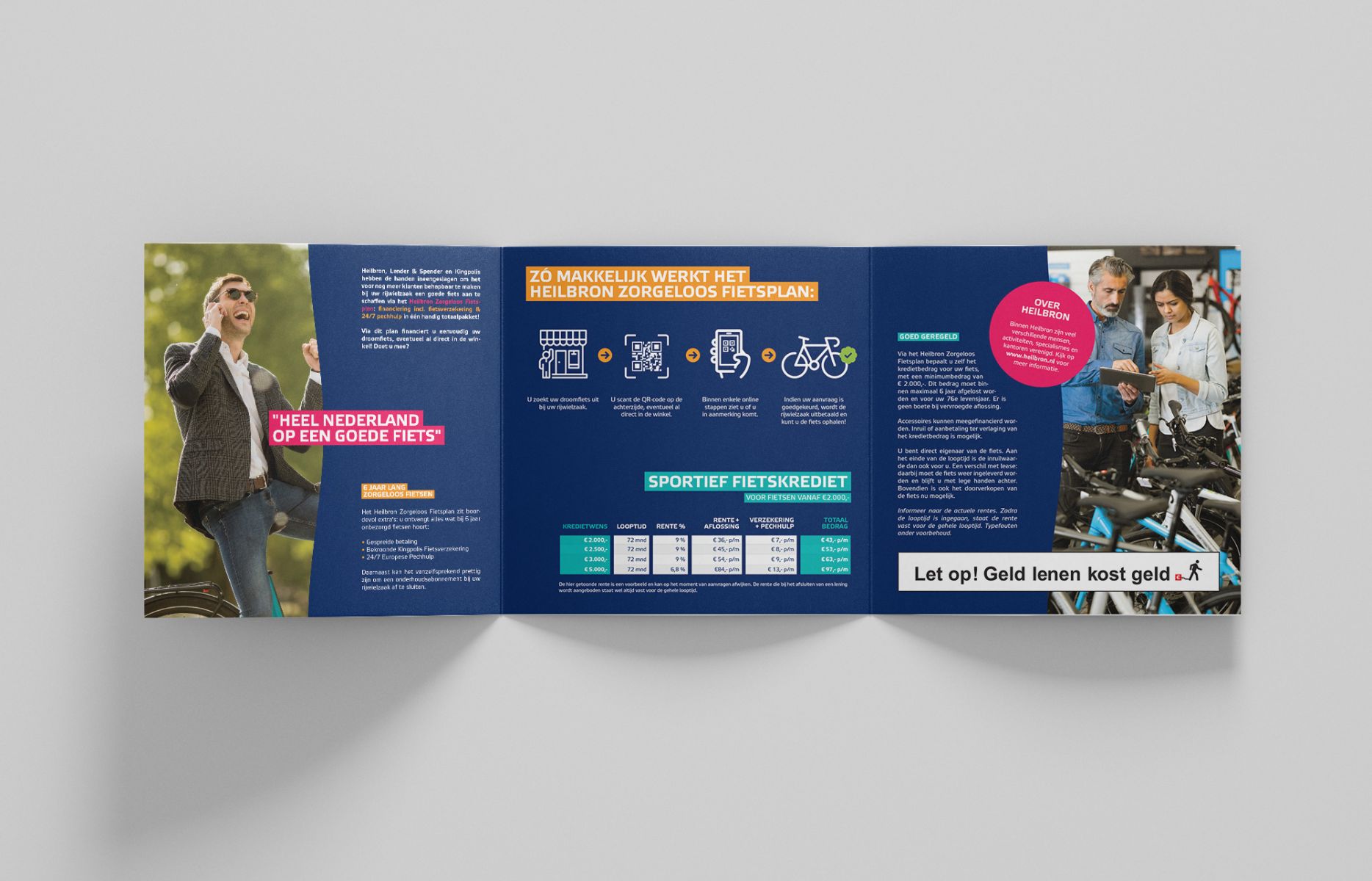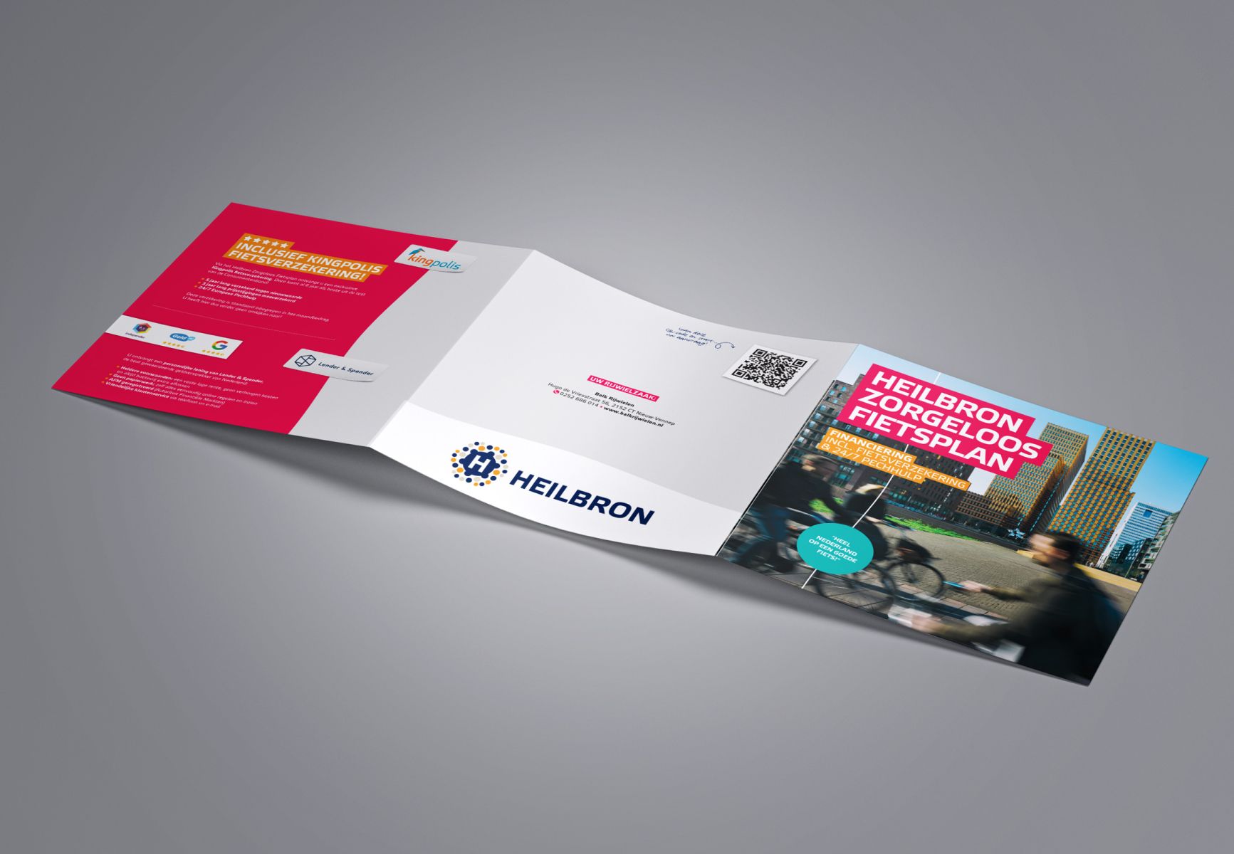 Het is de gezamenlijke missie van Heilbron, Lender & Spender en Kingpolis om heel Nederland aan een goede fiets te helpen. Dus hebben ze hun handen ineengeslagen, om het voor nog meer klanten behapbaar te maken een goede fiets aan te schaffen bij hun dealer via het Heilbron Zorgeloos Fietsplan: financiering, verzekering en pechhulp in één handig totaalpakket! Bij lekker in vorm mochten we hiervoor een drieluik ontwerpen en voor diverse dealers personaliseren.