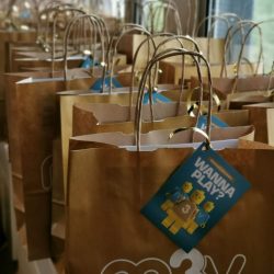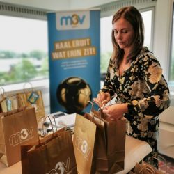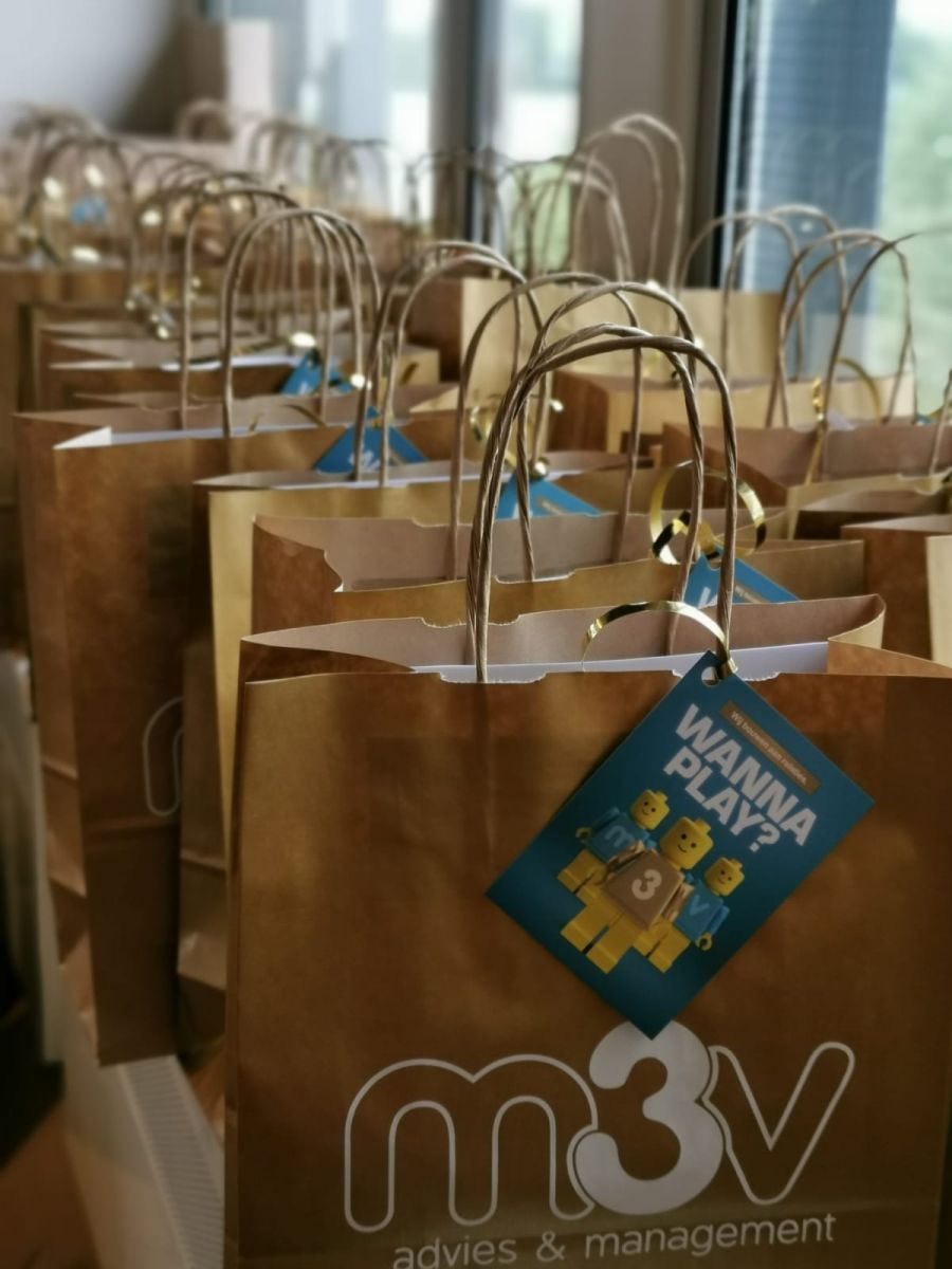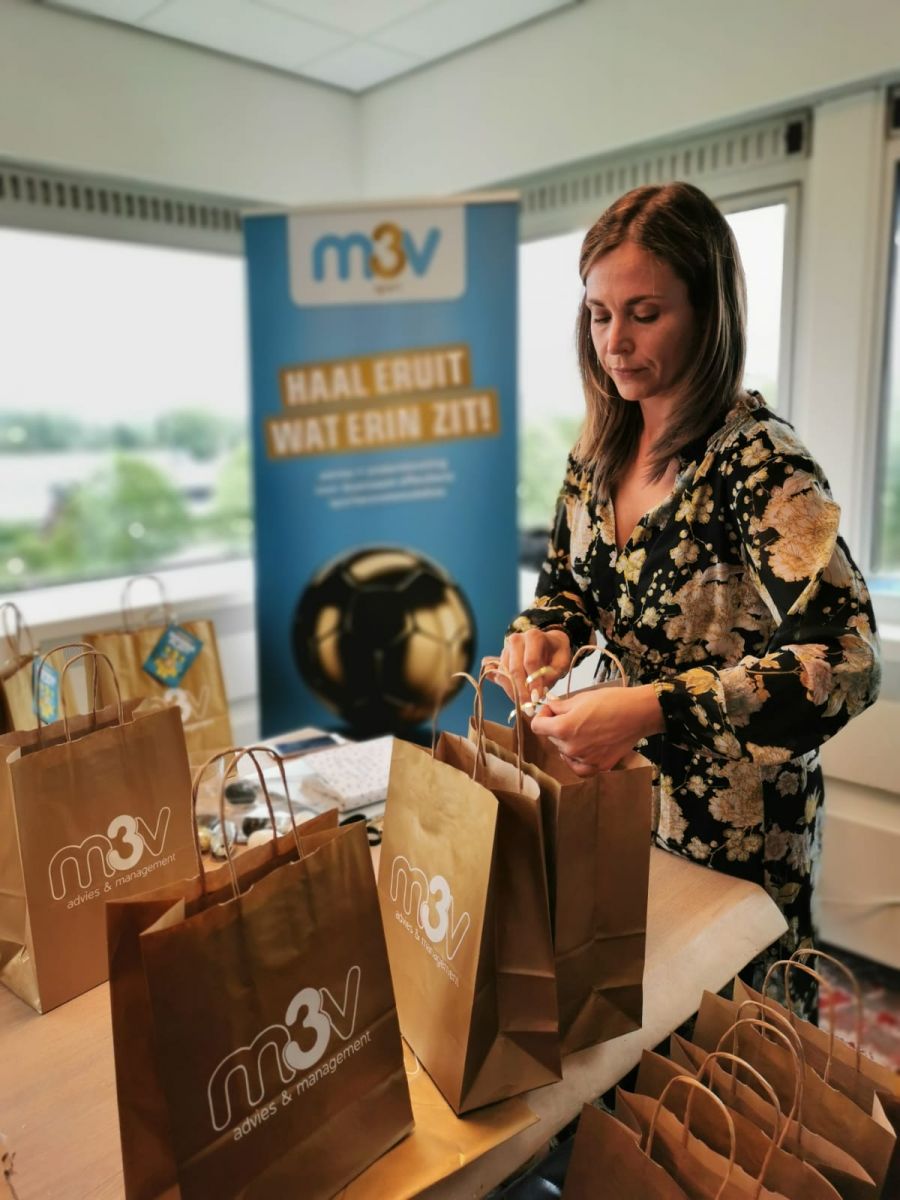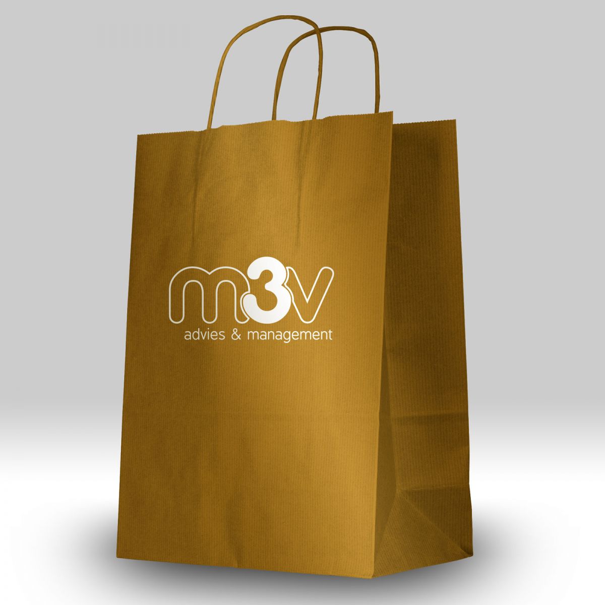Om diverse items van M3V op een elegante manier mee te geven op bijvoorbeeld beurzen, zorgden we bij lekker in vorm voor een goudkleurig papieren tasje, voorzien van een logo.