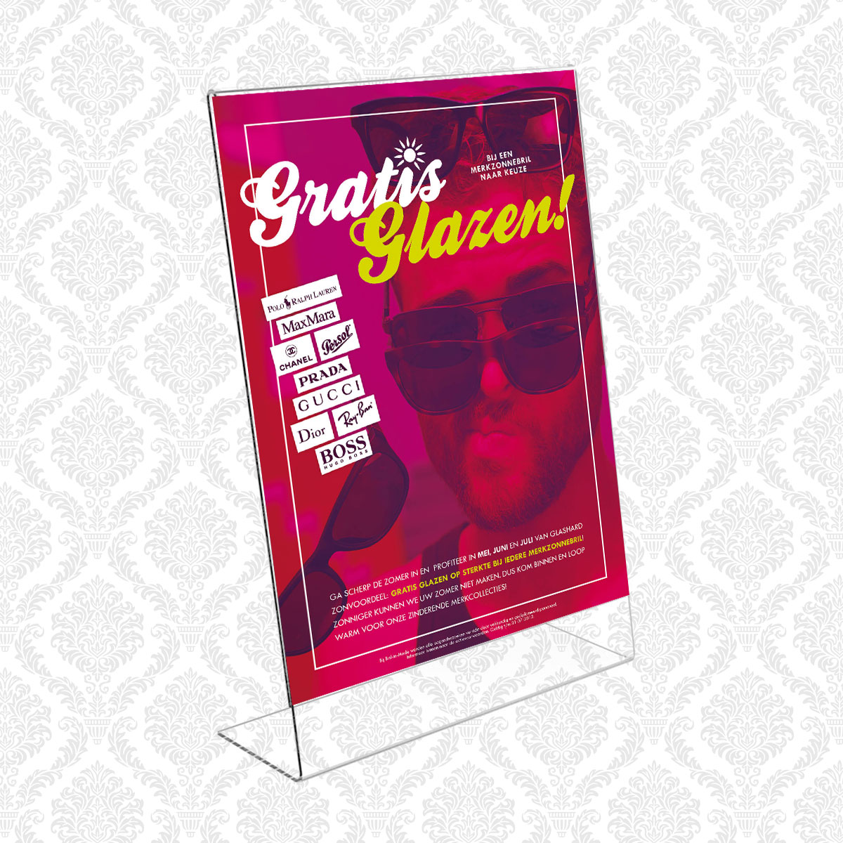Ga scherp de zomer in en profiteer in mei, juni en juli van glashard zonvoordeel bij Bril-in-Mode: gratis glazen op sterkte bij iedere merkzonnebril. lekker in vorm ontwierp een huis-aan-huisflyer en bijpassend pos-materiaal voor deze zinderende actie.