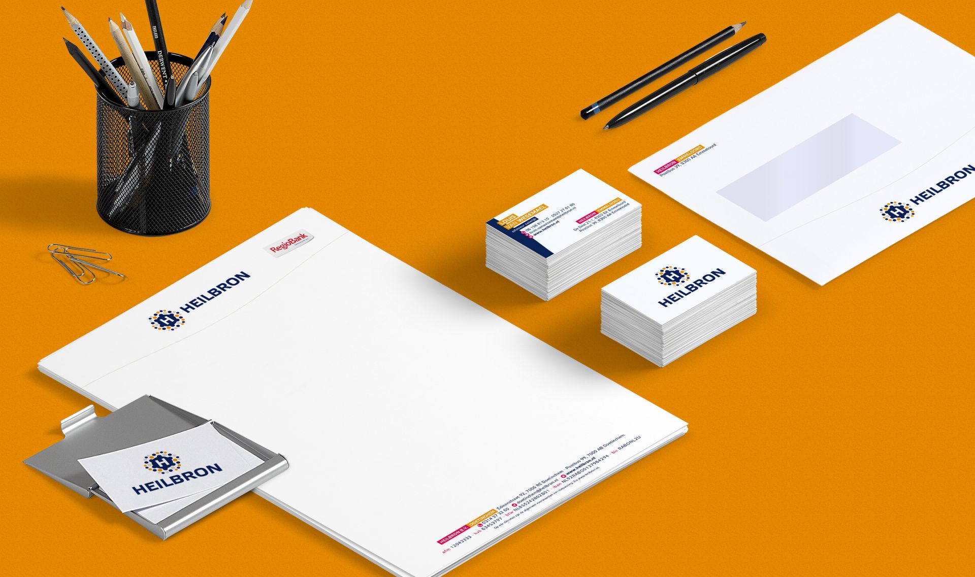 De introductie van een aangepast logo is ook het ideale moment om de bijbehorende huisstijldragers onder de loep te nemen. Bij lekker in vorm ontwierpen we daarom voor Heilbron & Heilbron Makelaardij nieuwe visitekaartjes, briefpapier (om zelf te printen via facturatiesoftware) en enveloppen in uniforme stijl.