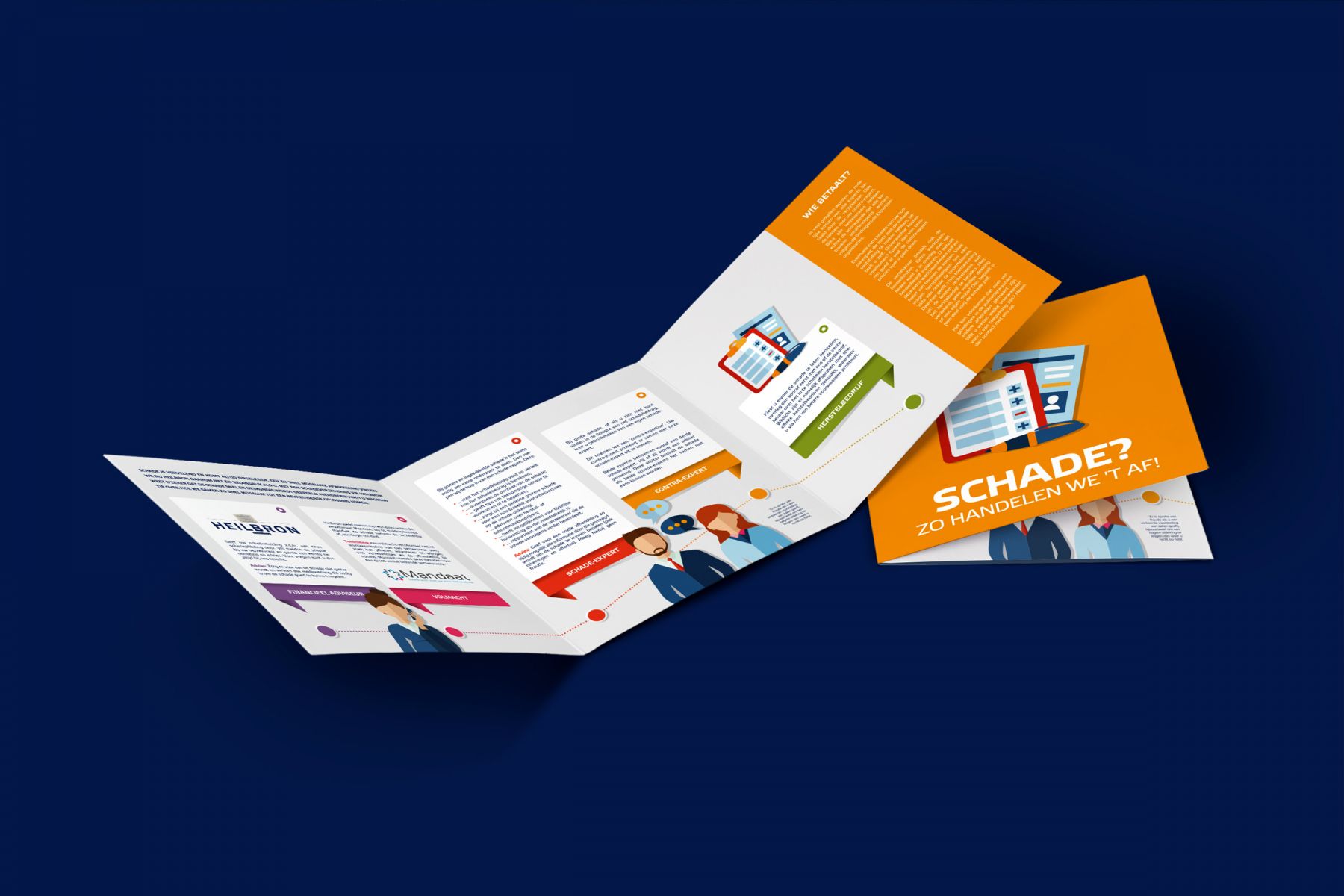 Om klanten eenvoudig in woord en beeld uit te leggen via welke kanalen en stappen hun schade afgehandeld wordt, mochten we bij lekker in vorm voor Heilbron een infografic in de vorm van een drieluik ontwerpen en schrijven.