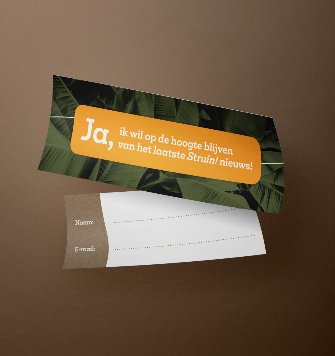 portfolio inschrijfkaartje nieuwsbrief Als je nooit meer iets wilt missen over Struin!, kun je je in de winkel inschrijven voor de online nieuwsbrief. Bij lekker in vorm mochten we er handige inschrijfkaartjes voor ontwerpen en laten drukken. inschrijfkaartjes nieuwsbrief