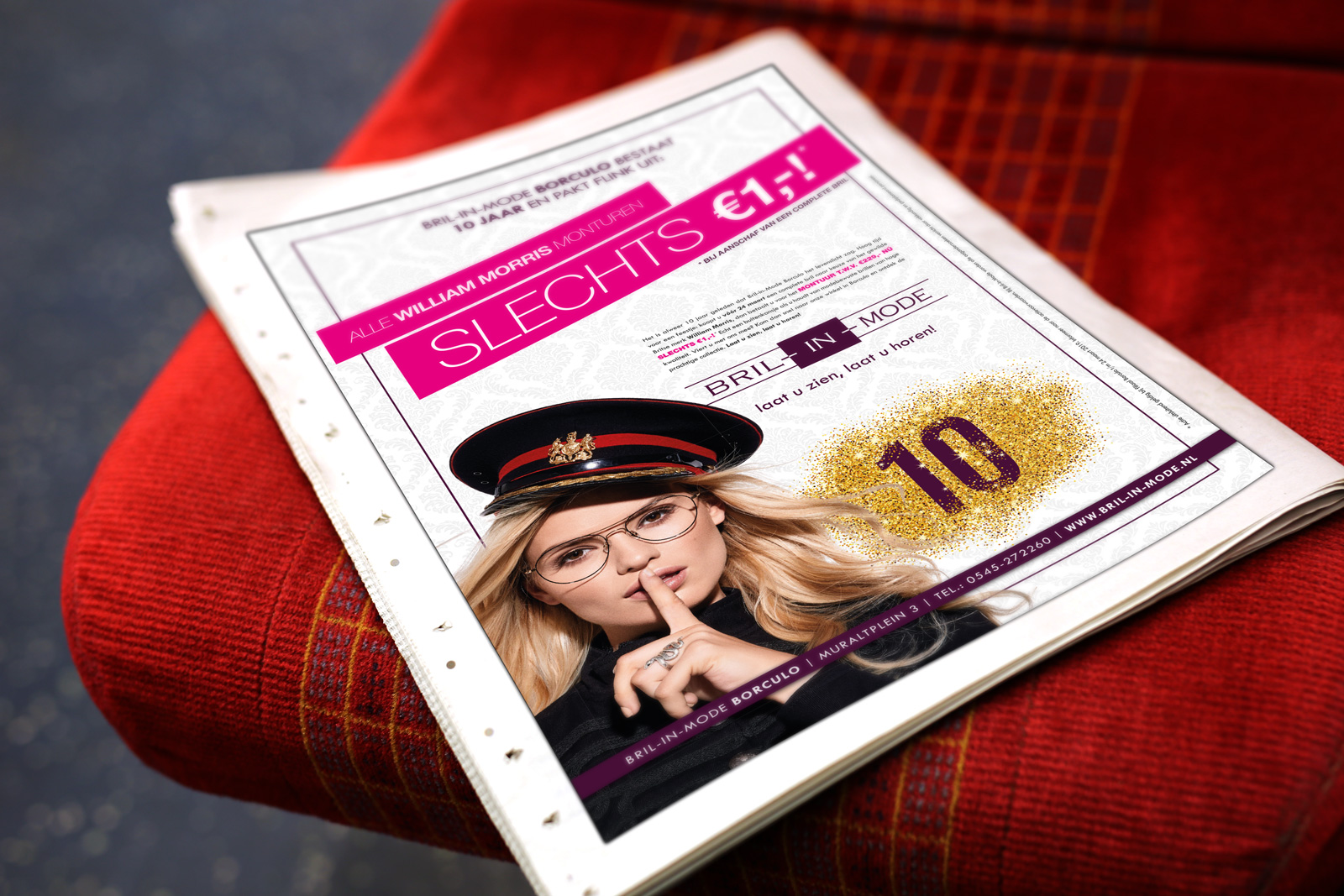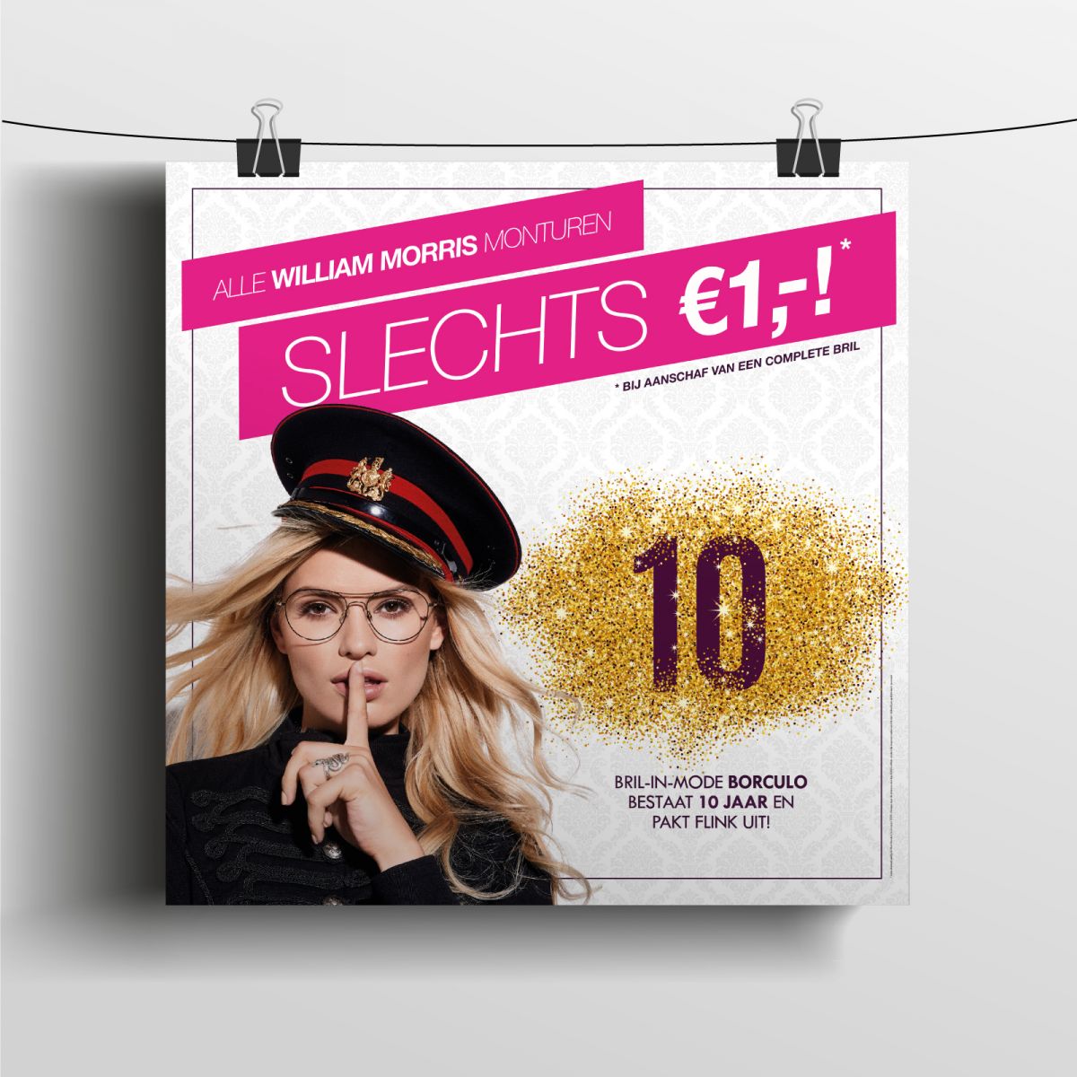 Het is alweer 10 jaar geleden dat Bril-in-Mode Borculo het levenslicht zag. Hoog tijd voor een feestje: koop je er momenteel een complete bril naar keuze van het gewilde Britse merk William Morris, dan betaal je voor het montuur t.w.v. €229,- slechts €1,-!