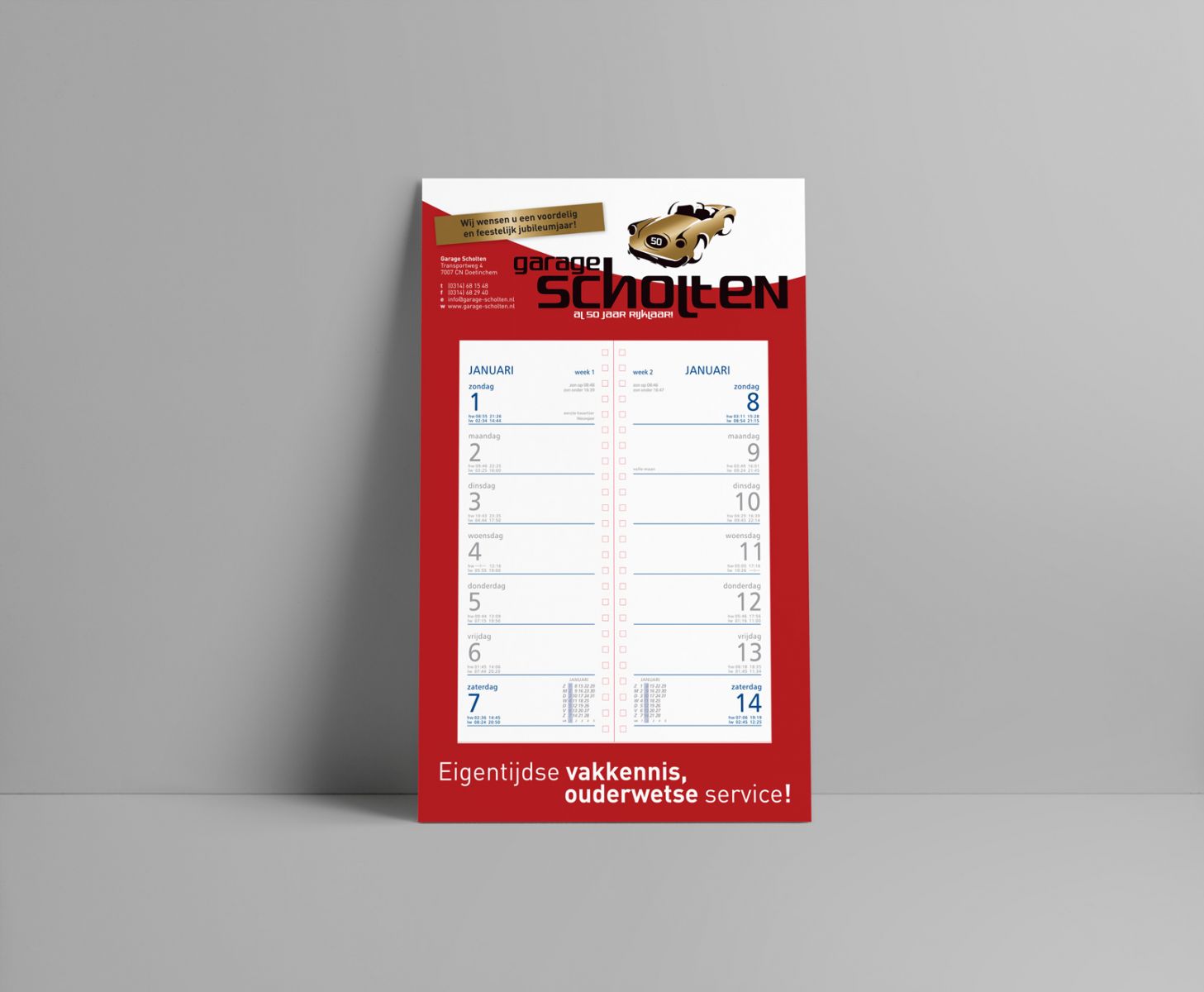 portfolio omslagkalender Menige klant kijkt telkens weer uit naar de praktische, jaarlijkse omslagkalender van Garage Scholten. lekker in vorm houdt het ontwerp regelmatig up to date. kalenderschild kalenderschild jubileumjaar