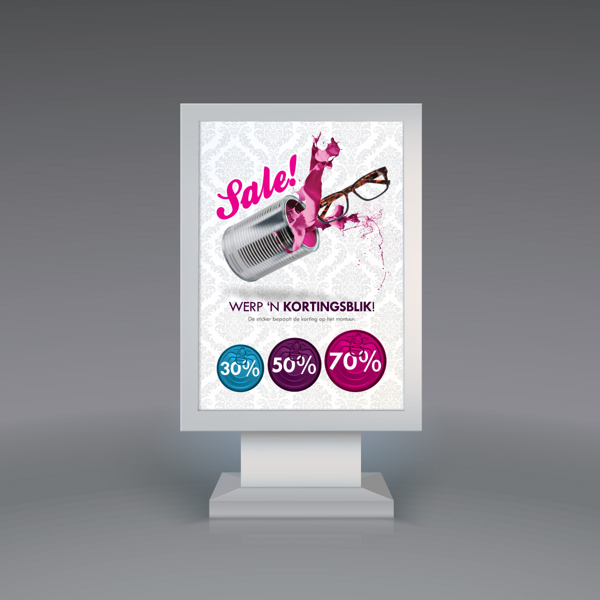 Het is sale bij Bril-in-Mode. De kleur sticker bepaalt de korting op het montuur. De campagne, genaamd ‘werp ’n kortingsblik’ wordt uitgebreid onder de aandacht gebracht middels een direct mailing (presale) naar vaste klanten, huis-aan-huis flyers, advertenties en diverse items in en rondom de winkel.