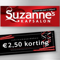 Vanwege het succes van de openingsflyer besloot Suzanne om ter gelegenheid van haar 1-jarig bestaan opnieuw een kortingsflyer te verspreiden. Wederom in het inmiddels herkenbare, langg