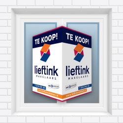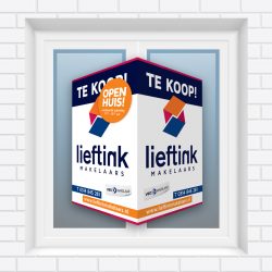 Makelaars zijn dol op V-borden, om op eenvoudige wijze hun ’te koop’ op een woning te bevestigen. lekker in vorm mocht een ontwerp ervan in de nieuwe huisstijl verzorgen. Handige toevoegingen: door middel van kleine, ronde statische stickers kan een gewijzigde verkoopstatus of open dag eenvoudig gecommuniceerd worden op hetzelfde bord, zonder bang te hoeven zijn voor beschadigingen bij verwijdering.