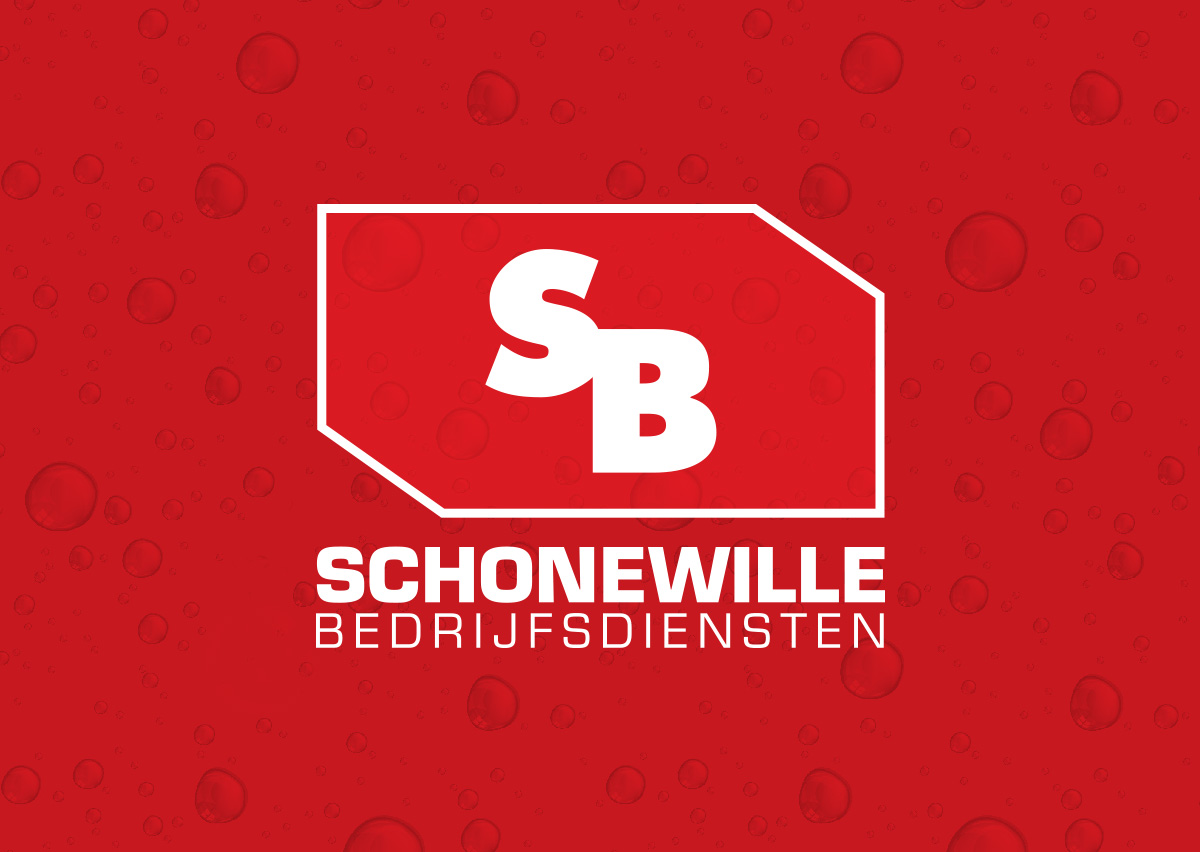Toen Schonewille Bedrijfsdiensten bij lekker in vorm kwam met het verzoek om diverse huisstijlitems te ontwikkelen, was het eerste advies om het bestaande logo verder te professionaliseren. Het veelgebruikte, maar kinderlijke lettertype Comic Sans werd vervangen door een stevig, zakelijk alternatief. Ook de harde zwarte rand verdween en maakte plaats voor een meer open en transparante uitstraling, vooral zichtbaar in de voornamelijk gebruikte dianegatieve versie op rode achtergrond. Tenslotte kreeg ook de volledige naam ‘Schonewille’ een plaats in het logo.