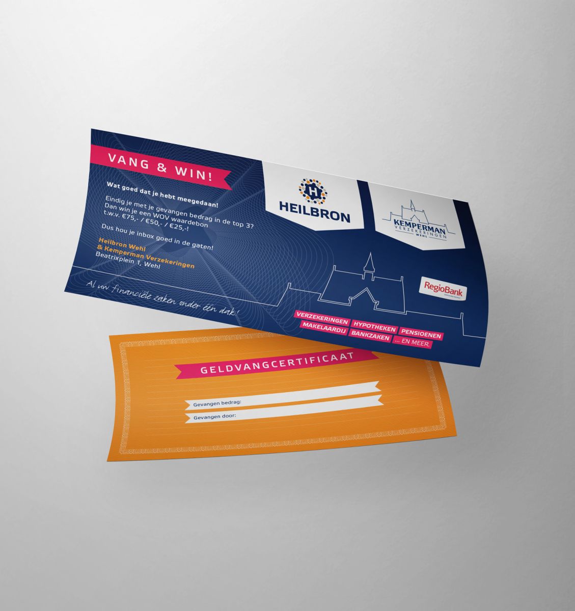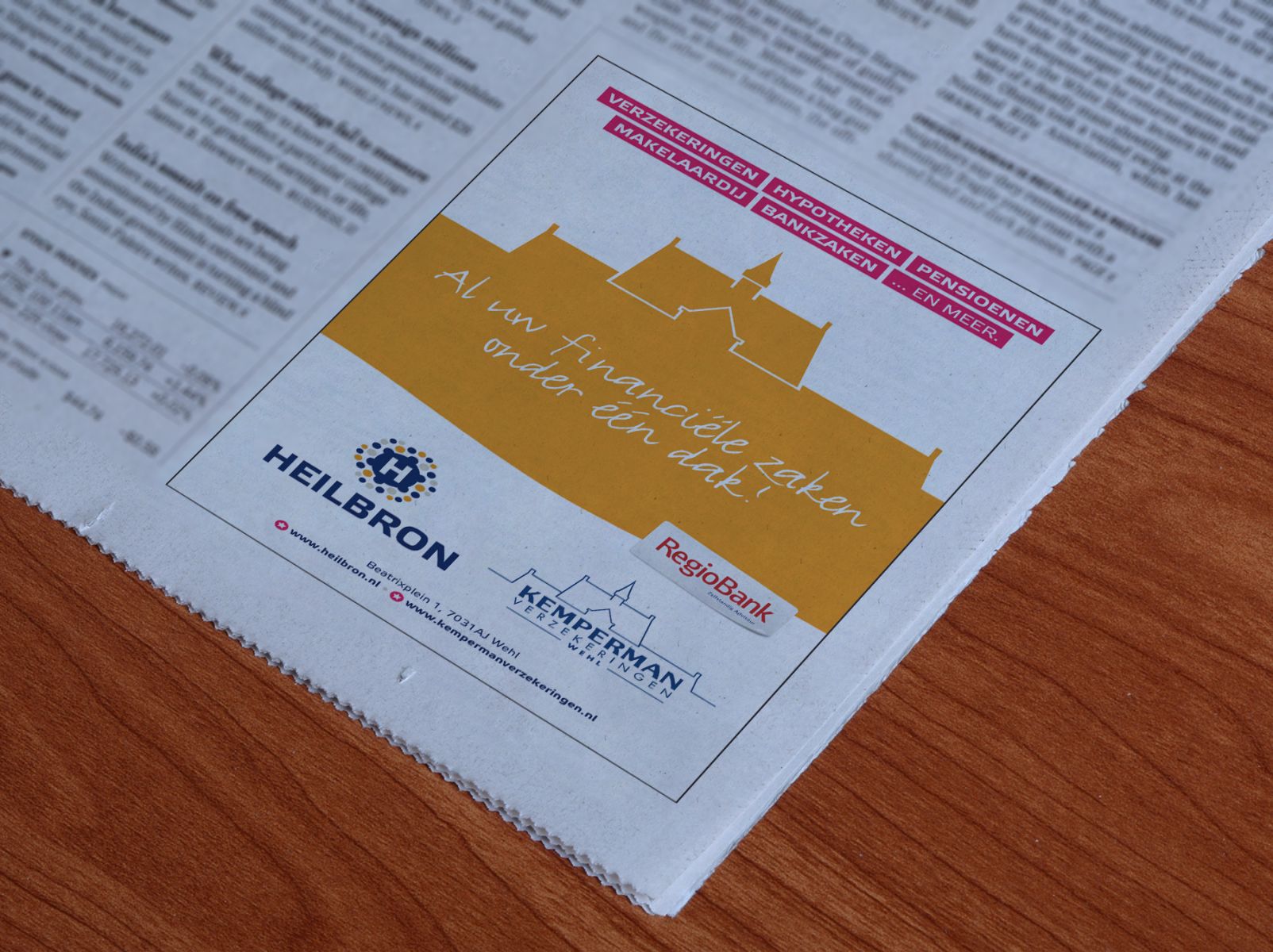 Heilbron Wehl en Kemperman Verzekeringen zitten samen in één pand en slaan de handen ineen om lokale evenementen te sponsoren, zoals het Dorpsfeest en de Wehleriade. Bij lekker in vorm gebruikten we de gemeenschappelijke vestigingsplek – het oude gemeentehuis van Wehl – als uitgangspunt voor een gecombineerd spandoek, een advertentie en een geldvangcertificaat voor een stand-actie.