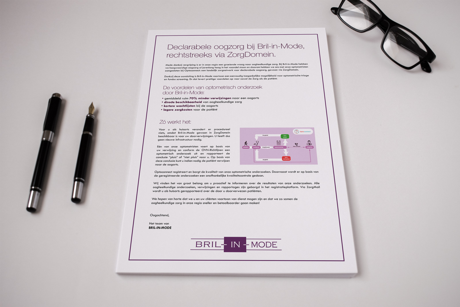 Bril-in-Mode is sinds kort aangesloten bij Optoconnect. Daarmee wordt het voor de huisarts gemakkelijk om patiënten naar Bril-in-Mode door te verwijzen voor onderzoeken. Sneller, goedkoper en ontlastend voor de oogarts. Bij lekker in vorm mochten we een tweedelige mailing maken om huisartsen op de hoogte te stellen: enerzijds een informerende brief over hoe Optoconnect werkt, anderzijds een uitnodiging voor een informerende Optische Avond in het Eyecenter van Bril-in-Mode.