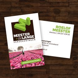 Na het restylen van het logo heeft lekker in vorm de nieuwe huisstijlkleuren en vormen doorgevoerd op de diverse huisstijldragers van Meester & De Lange Verzekeringen. Niet alleen de frisse kleuren dragen bij aan een sterke herkenbaarheid, maar ook het gebruik van een opvallend polderbeeld op onder andere de visitekaartjes.