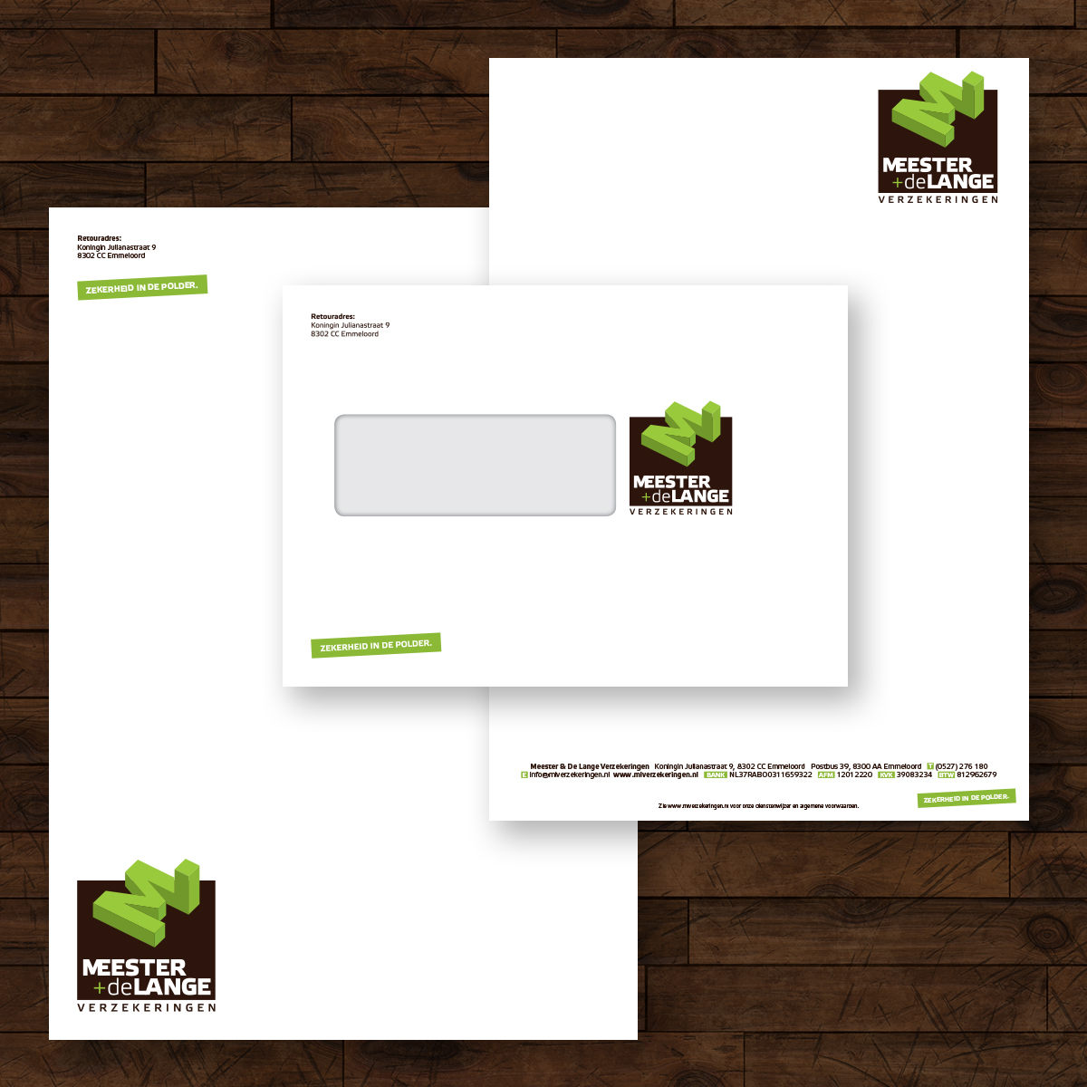 Na het restylen van het logo heeft lekker in vorm de nieuwe huisstijlkleuren en vormen doorgevoerd op de diverse huisstijldragers van Meester & De Lange Verzekeringen. Niet alleen de frisse kleuren dragen bij aan een sterke herkenbaarheid, maar ook het gebruik van een opvallend polderbeeld op onder andere de visitekaartjes.