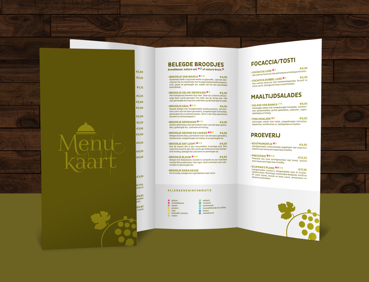 Bij Dijkman Delicatessen kun je niet alleen lekker inkopen doen, maar voortaan ook lekker ter plekke genieten van veel smaakvolle gerechten en dranken. lekker in vorm mocht het drieluik-menu ontwerpen met daarin onder andere duidelijk aangegeven allergie indicatoren. Het eindontwerp werd mooi mat afgelamineerd om vlekken tegen te gaan.