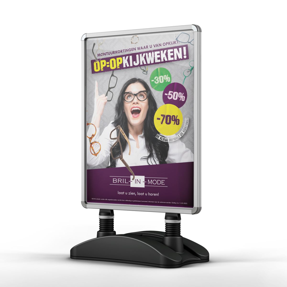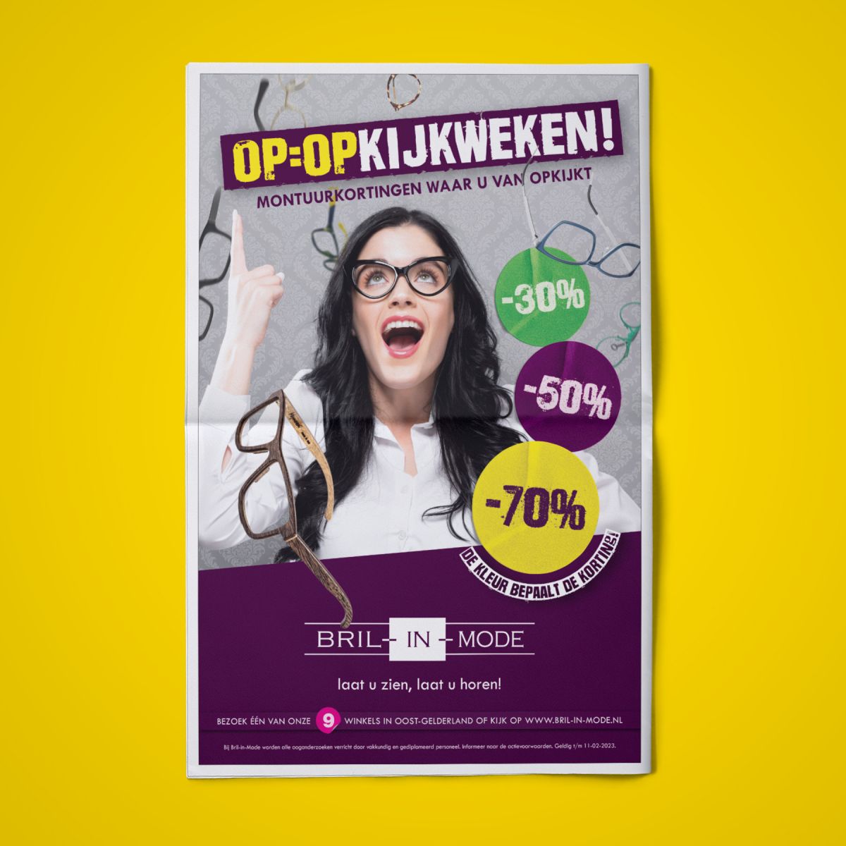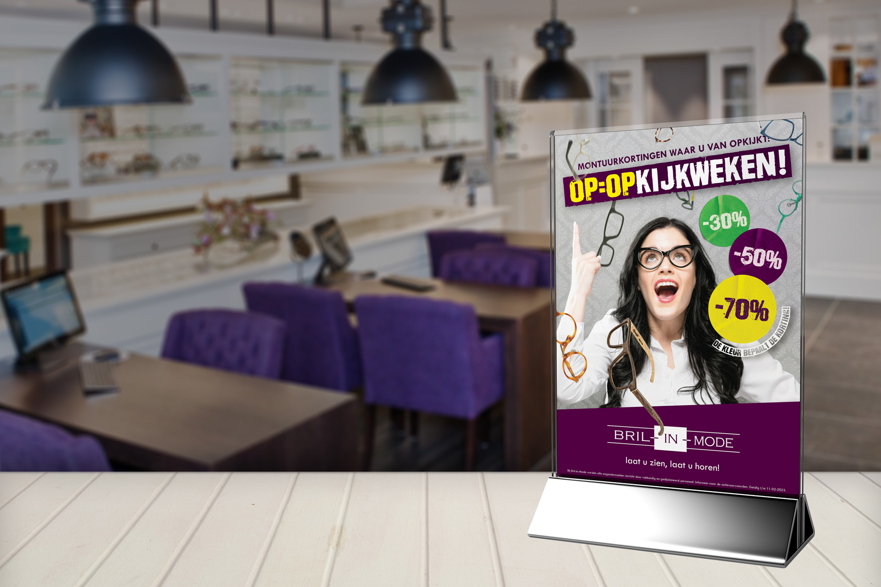 Bil-in-Mode start ze het jaar goed met haar populaire Op=Opkijkweken: montuurkortingen die oplopen tot wel 70%! De kleur sticker op het montuur bepaalt de korting.